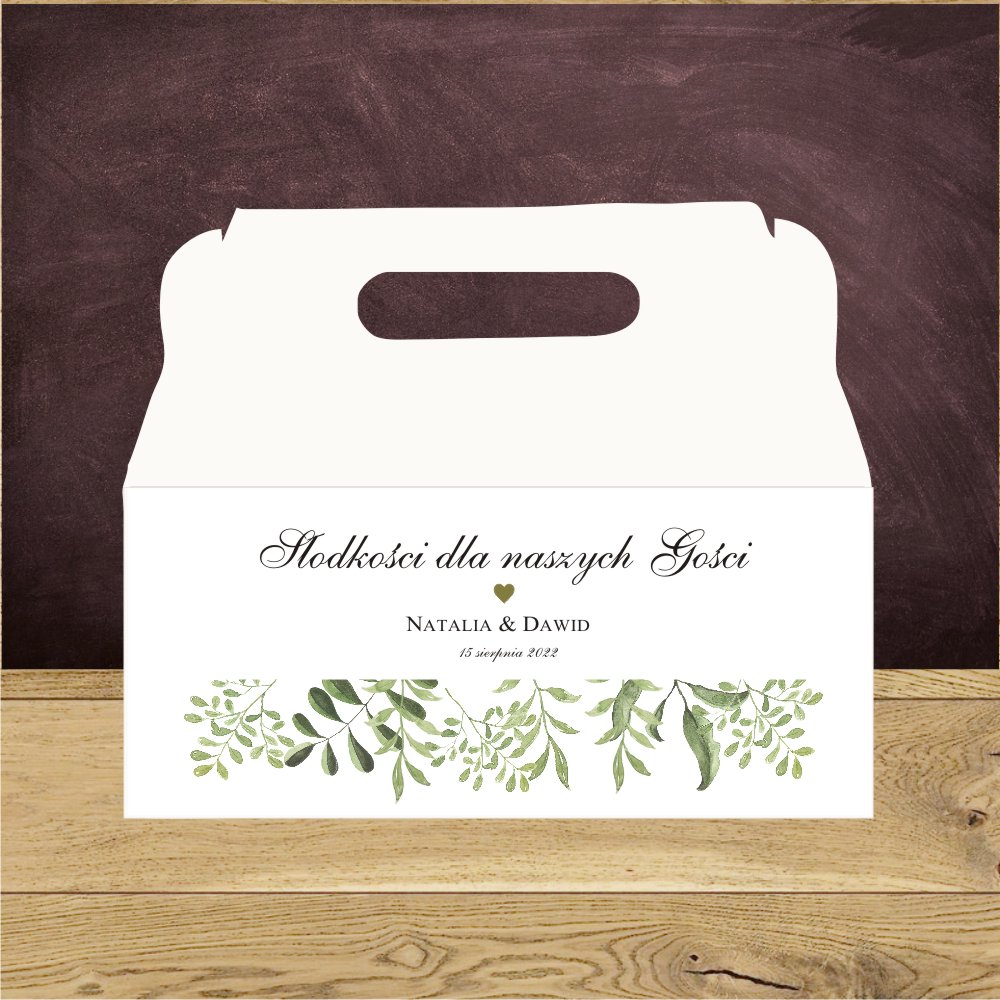 Pudełko na ciasto weselne wręczone na koniec przyjęcia to piękna tradycja, szczególnie jeśli opakowanie jest personalizowane imionami Państwa Młodych oraz cudownymi zielonymi gałazkami.