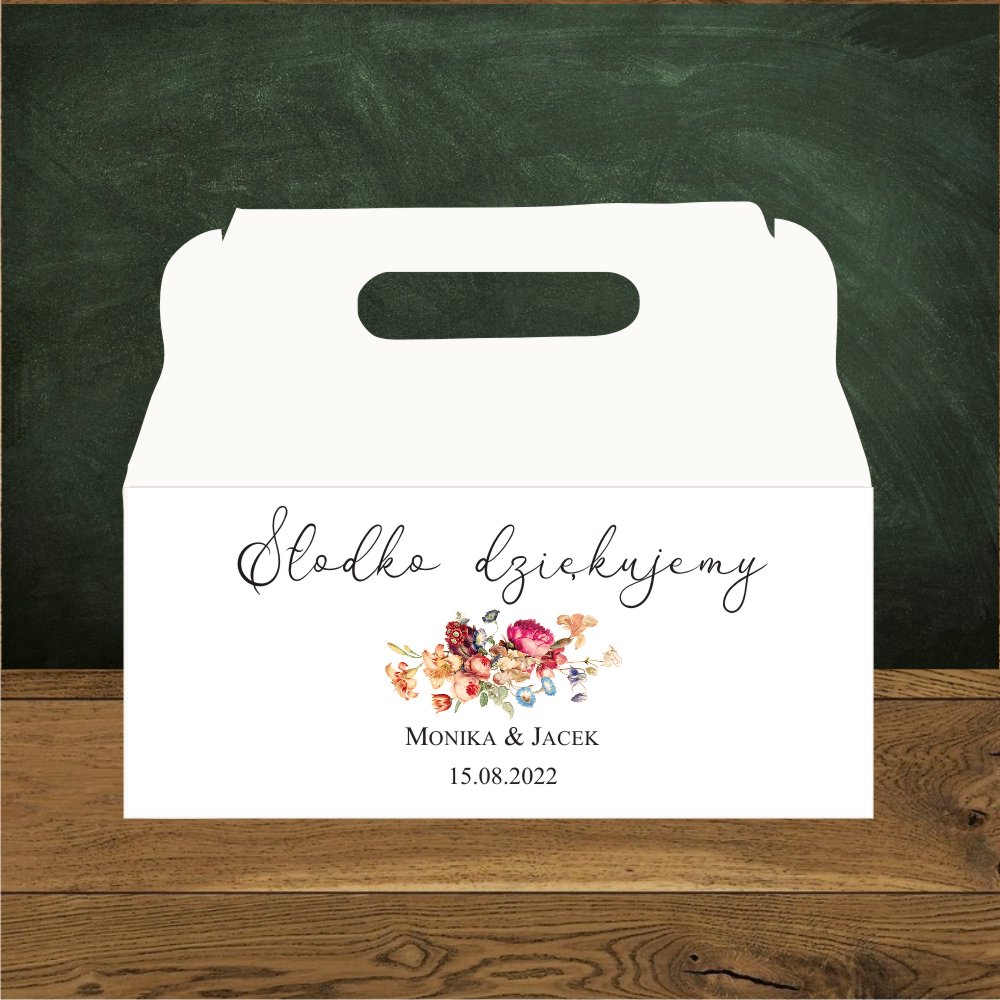 Pudełko na tort weselny wręczone gościom na koniec przyjęcia to piękna tradycja, szczególnie jeśli opakowanie jest personalizowane imionami Państwa Młodych oraz cudowną grafiką w stylu retro z kwiatami w kolorach bordo, złota i błekitu.
