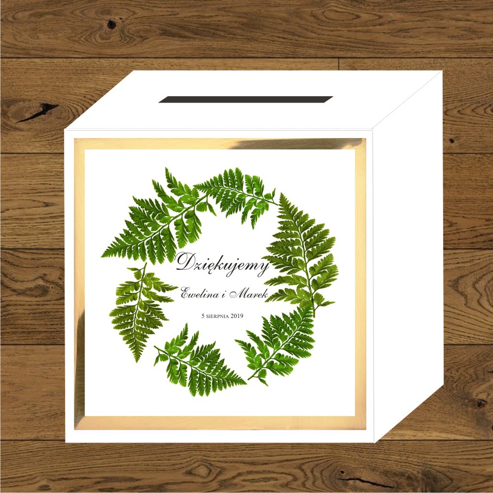 Zaposzenie ślubne z gałązkami paprotki. Kwadratowe, proste. Paprotka