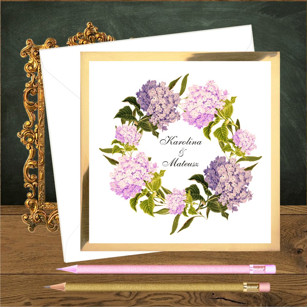 Zaproszenia na ślub z różowymi hortensjami w wianku