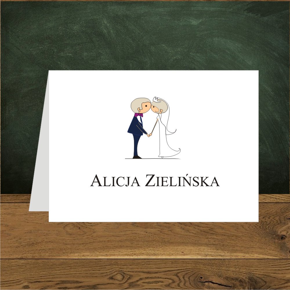 Winietka ślubna ustawiona na stole spełnia kilka funkcji organizacyjnych i przede wszystkim jest ozdobą. Prezentowana tutaj przedstawia humorystycznie Parę Młodą.