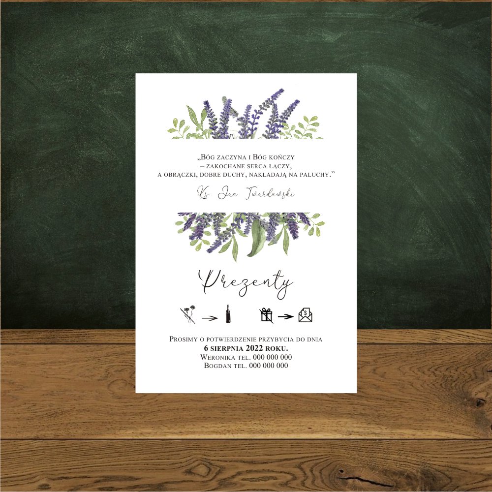 Piękne zaproszenia ślubne w stylu boho z lawendą. Lawendowy ogród. Kwadratowe, naklejane na złoty kartonik