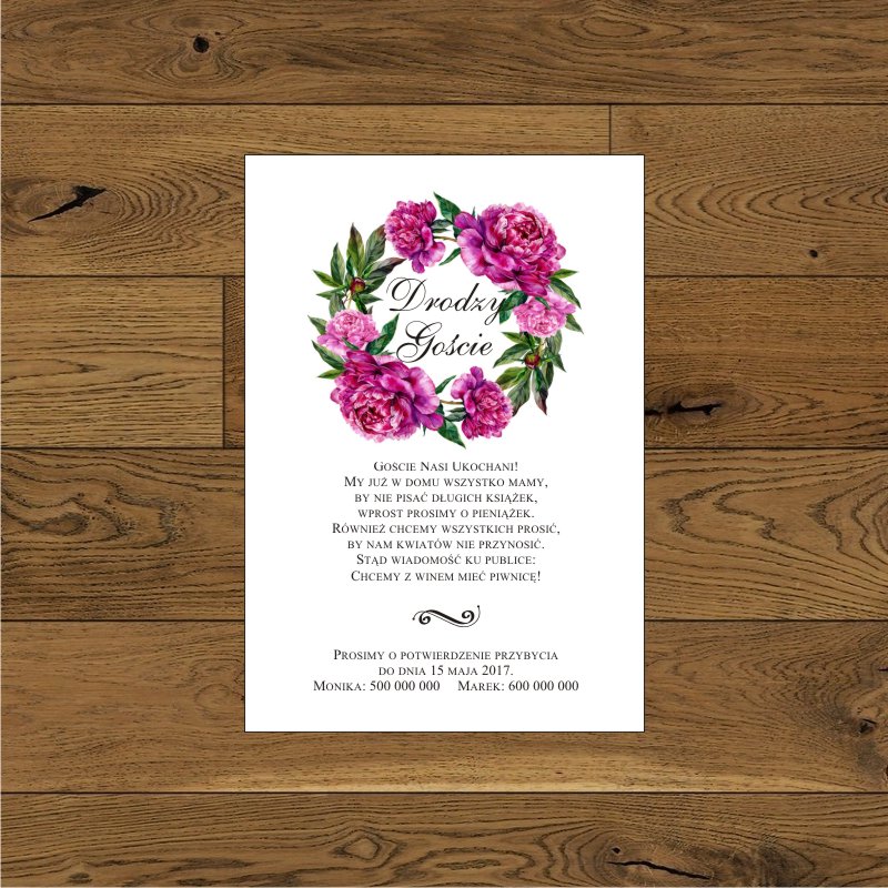 Ekskluzywne zaproszenia slubne piwonie wianek fuksja. Zaproszenie w kolorach złota i fuksji