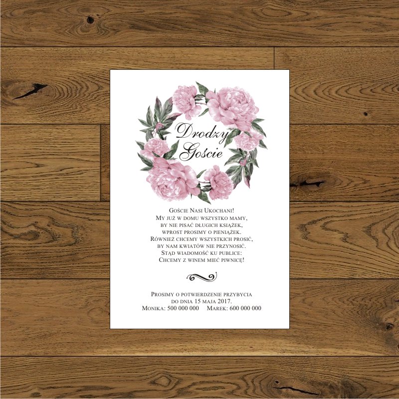 Zproszenia na wesele z piwoniami srebro różowe. Lodowy rózowy