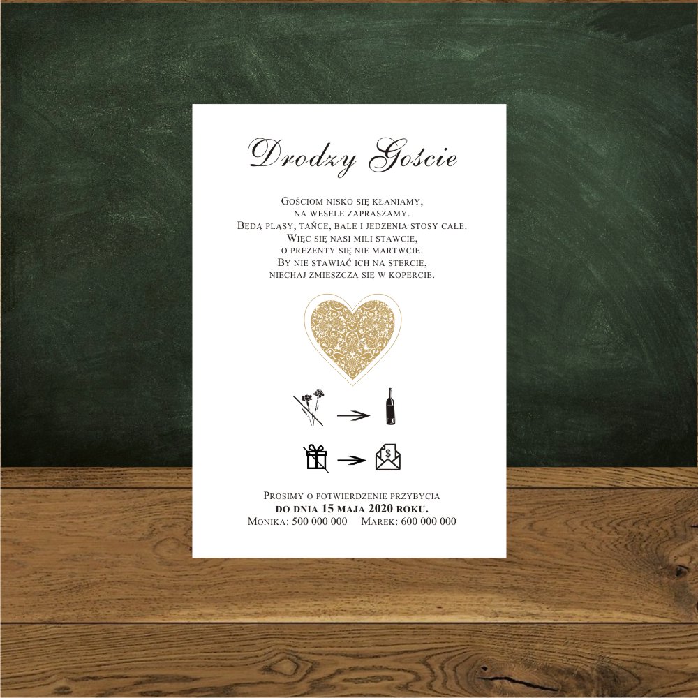 Zaproszenia ślubne glamour z sercem na złotym kartoniku. Serce złote