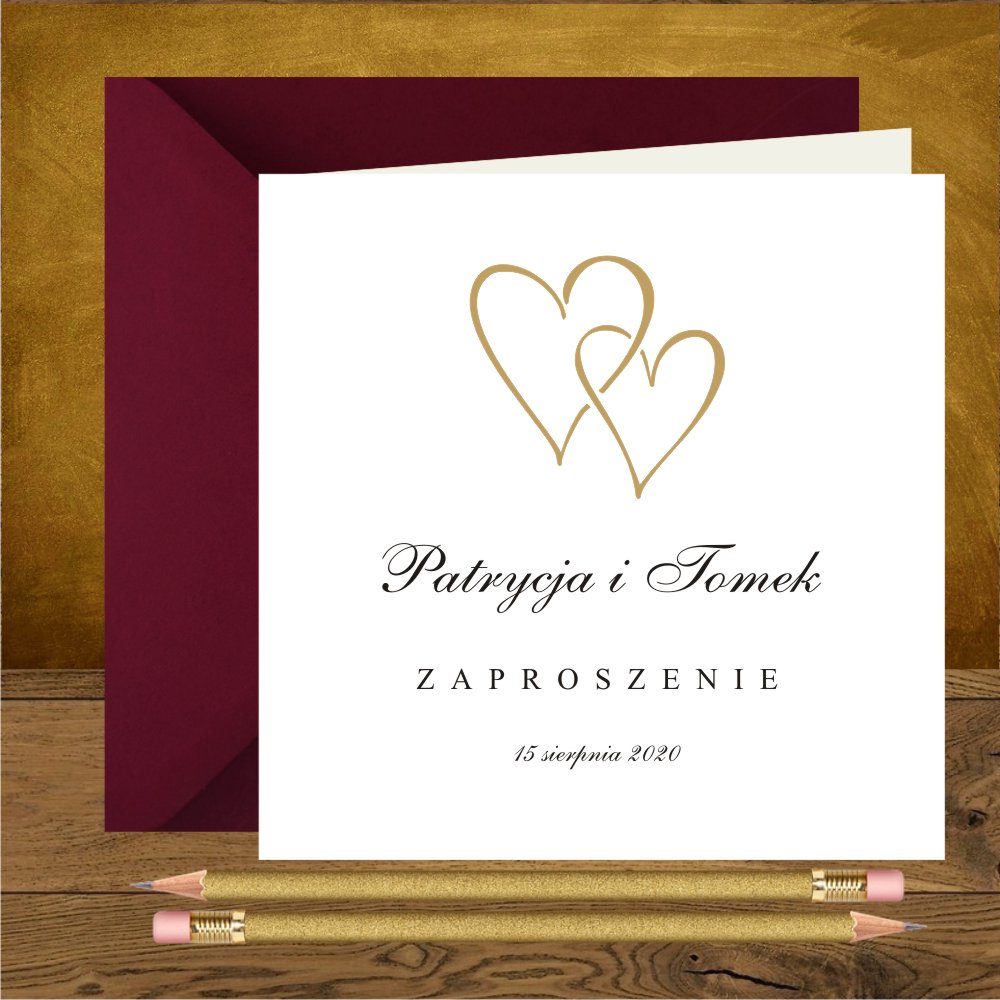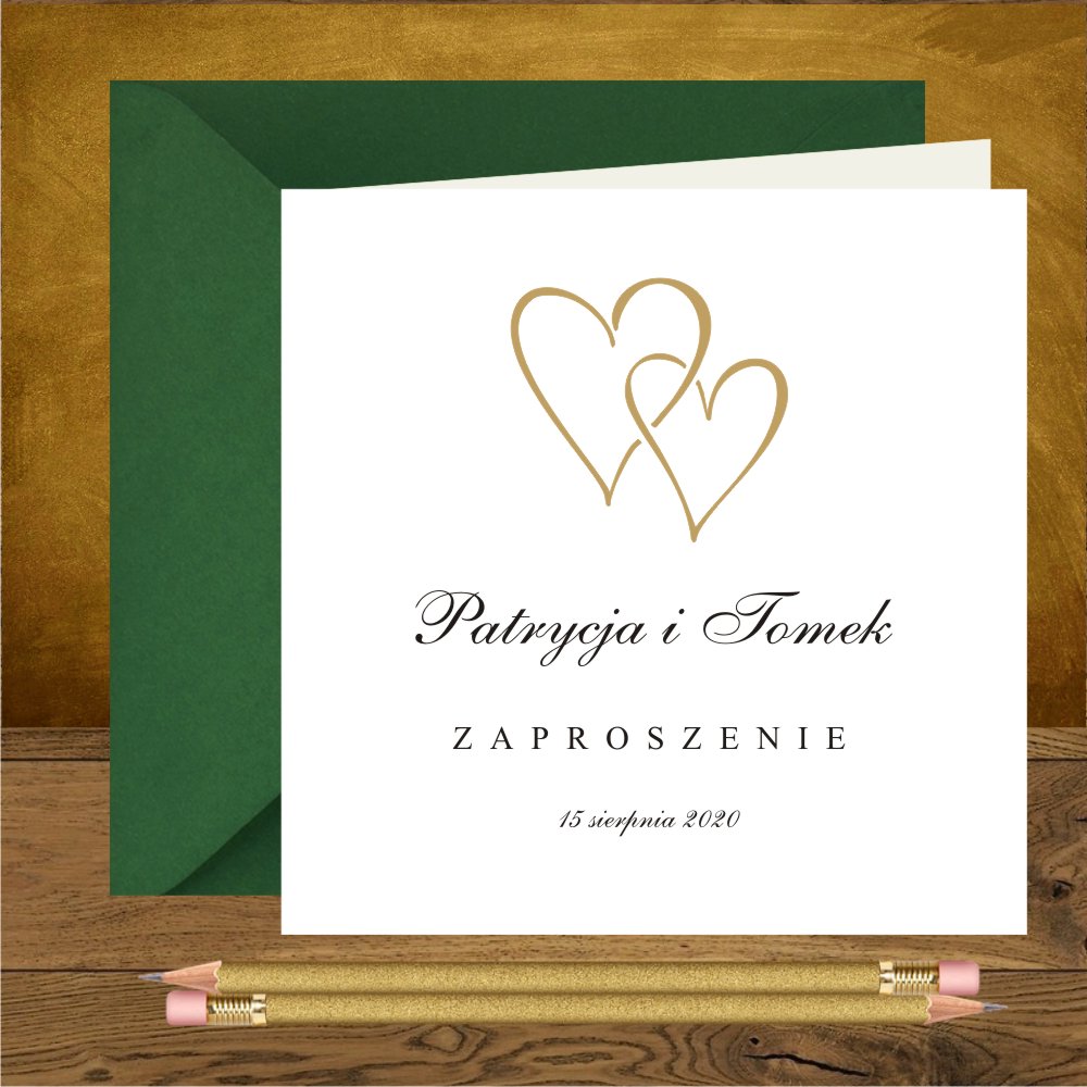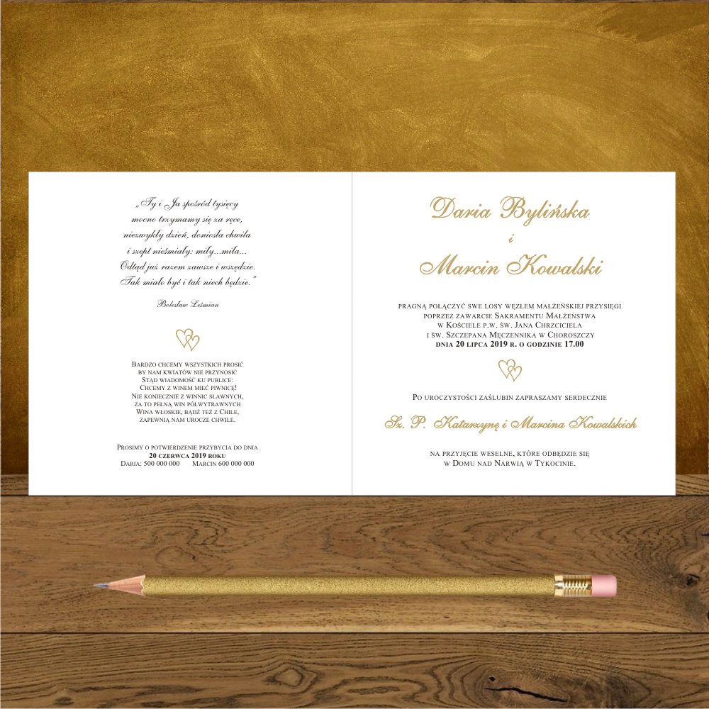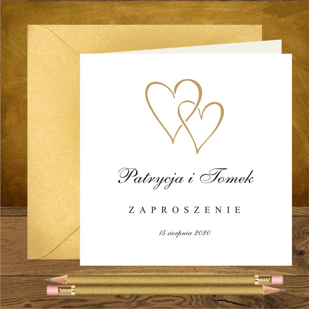 Zaproszenia na ślub z dwoma zlotymi serduszkami fantazyjne