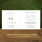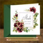 Opis: zaproszenia wykonane z papieru białego. Na froncie zielone listki i kwiaty w kolorystyce bordo ułożone w iryginalny sposób. Zaproszenie idealne na wesela w stylistyce boho, rustykalnej. Zaproszenia kwiatowe to bardzo modny trend w zaproszeniach ślubnych ostatnich lat.