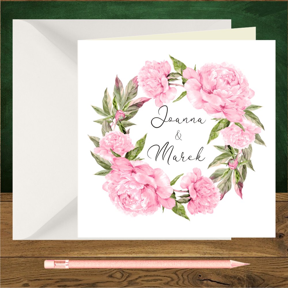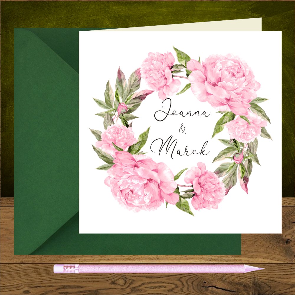 Piękne zaproszenie na wesele z różowymi piwoniami w wianku z nowoczesną ozdobną czcionką. Na pleckach zaproszenia inicjały i wianuszek kwiatów piwonii. Wyjątkowo korzystnie to kwiatowe zaproszenie przezentuje się z różową kopertą tworząc romantyczny styl.