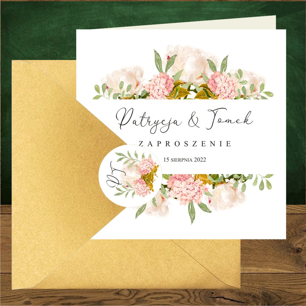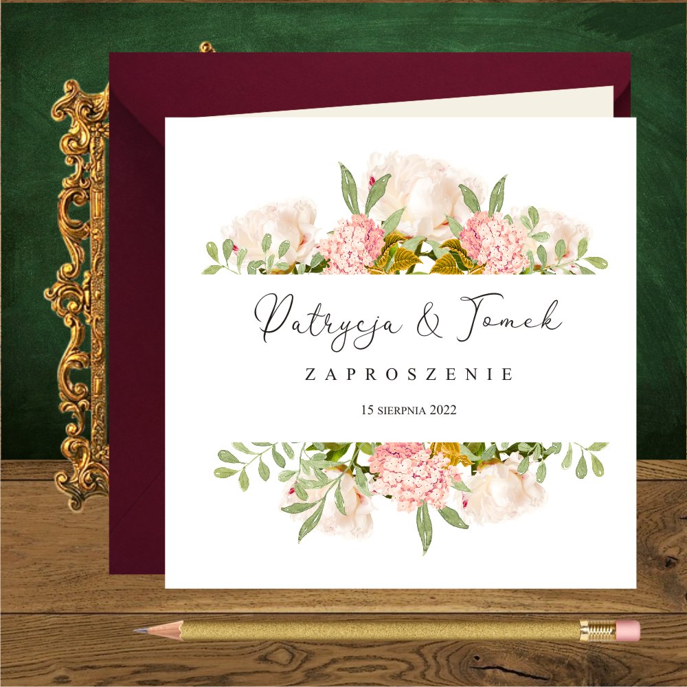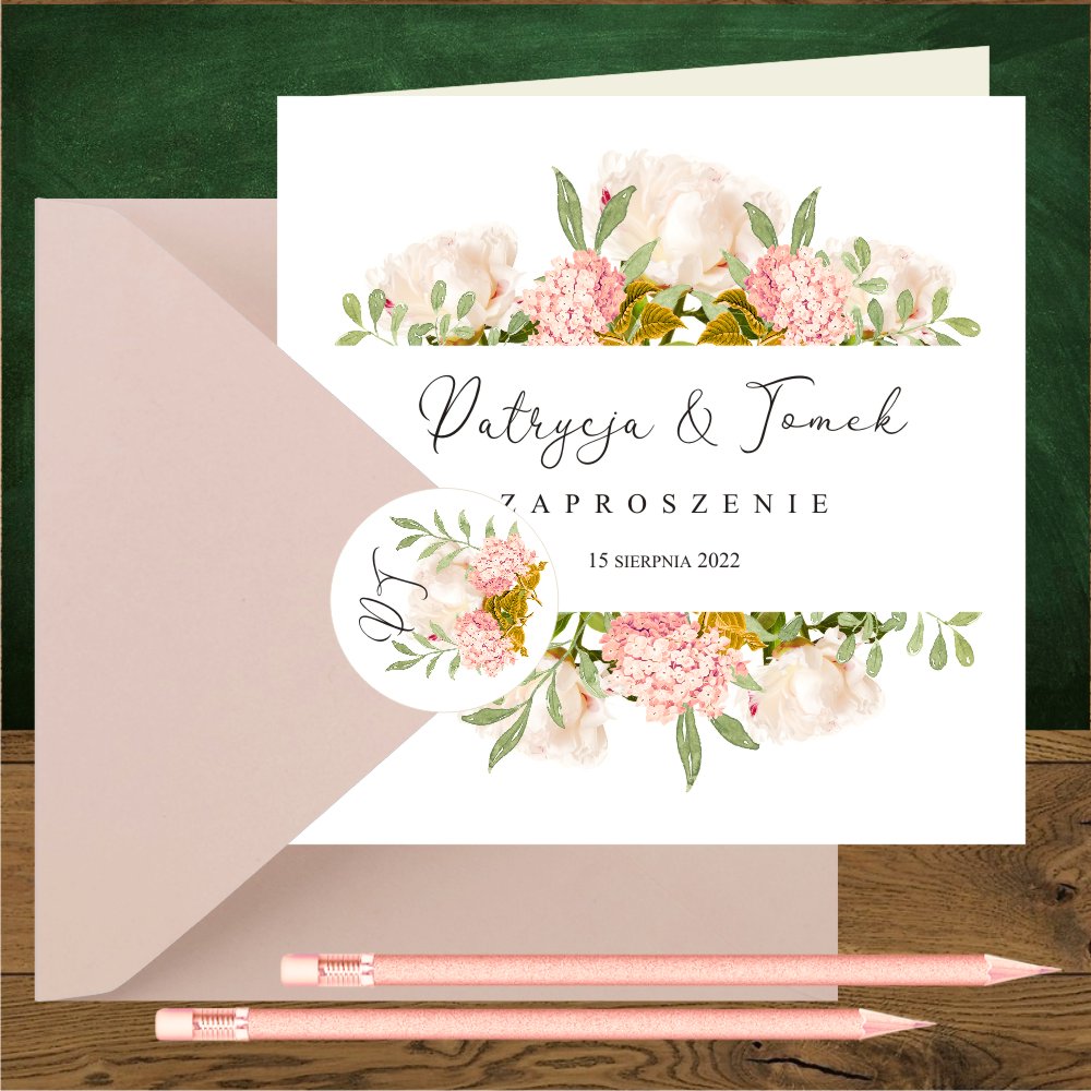 Różowe kwiaty w eleganckich zaproszeniach idealnie wpasują się romantyczny styl wesela. Piwonie i hortensje na sali i w dodatkach ślubnych, menu, zawieszkach na alkohol oczarują gości.