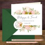Zaproszenia weselne w stylu romantycznym z elementami boho z motywem kwiatów w kolorze pastelowego różu i chłodnego ecru. Hitem nowego sezonu ślubnego są pastele w różnym stopniu nasycenia barwą. Kwiaty poprzeplatane zielonymi gałązkami tworzą piękną kompozycję. Zaproszenia są wykonane z pięknego papieru, na odwrocie zaproszenia ślubnego mamy stylowy monogram. Możliwa jest personalizacja plecków tego zaproszenia specjalnie do koperty transparentnej. Fantazyjna czcionka nadaje zaproszeniom nowoczesności. Do wyboru koperty w kolorze pastelowego różu, pięknej nasyconej zieleni , biała, ecru, złota, bordo. Szczególnie pięknie prezentuje się z koperta bordo, złota i różowa nadając zaproszeniu elegancji. Zaproszenie może być personalizowane w środku lub na kopercie.