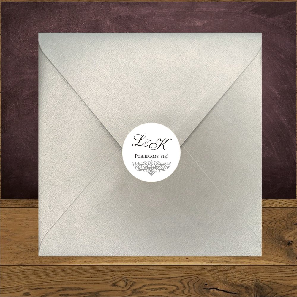 Naklejka na kopertę w kształcie kółeczka. Wykonana z papieru takiego jak użyty w zaproszeniach. |