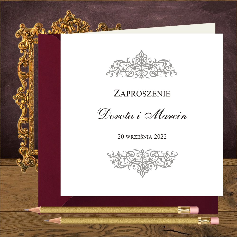 Do zaproszeń pasuje koperta ze srebrnego metalizowanego papieru lub w kolorze pastelowego rózu (nude) Ciekawie prezentuje się także z koperta w kolorze bordowym.