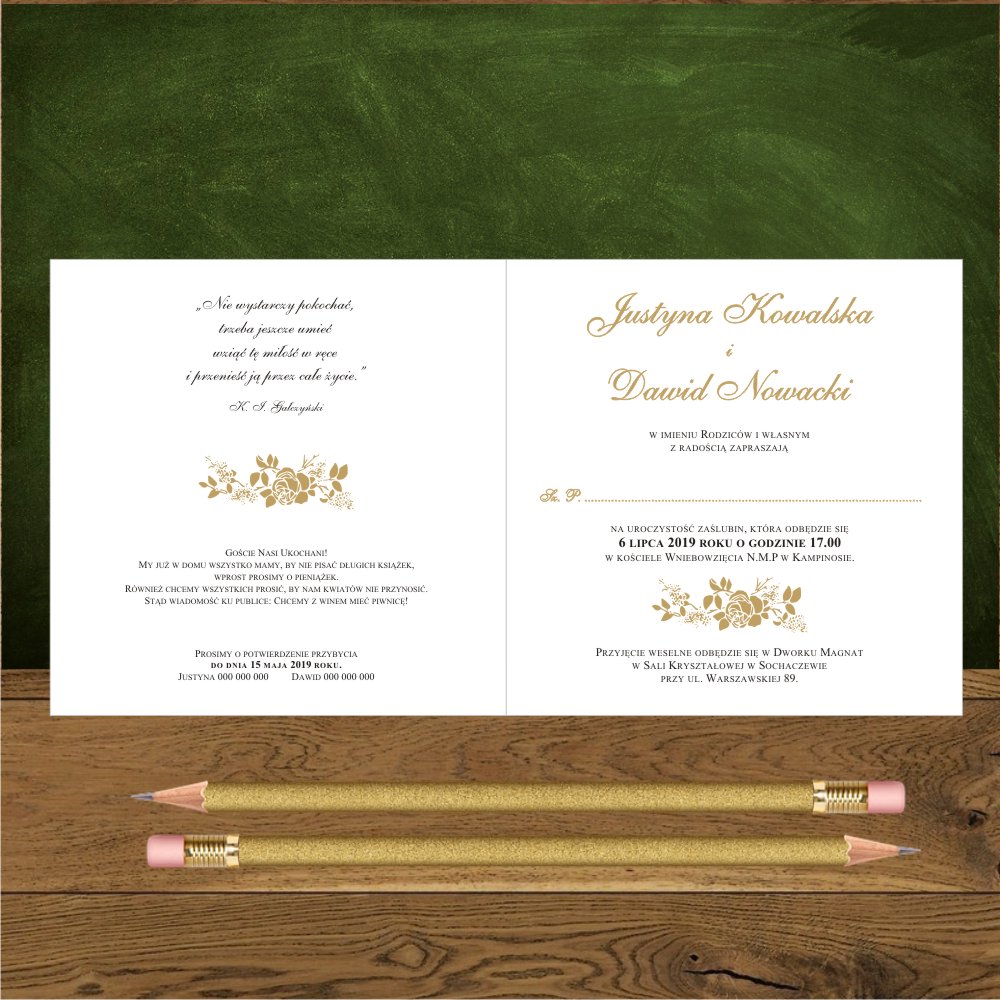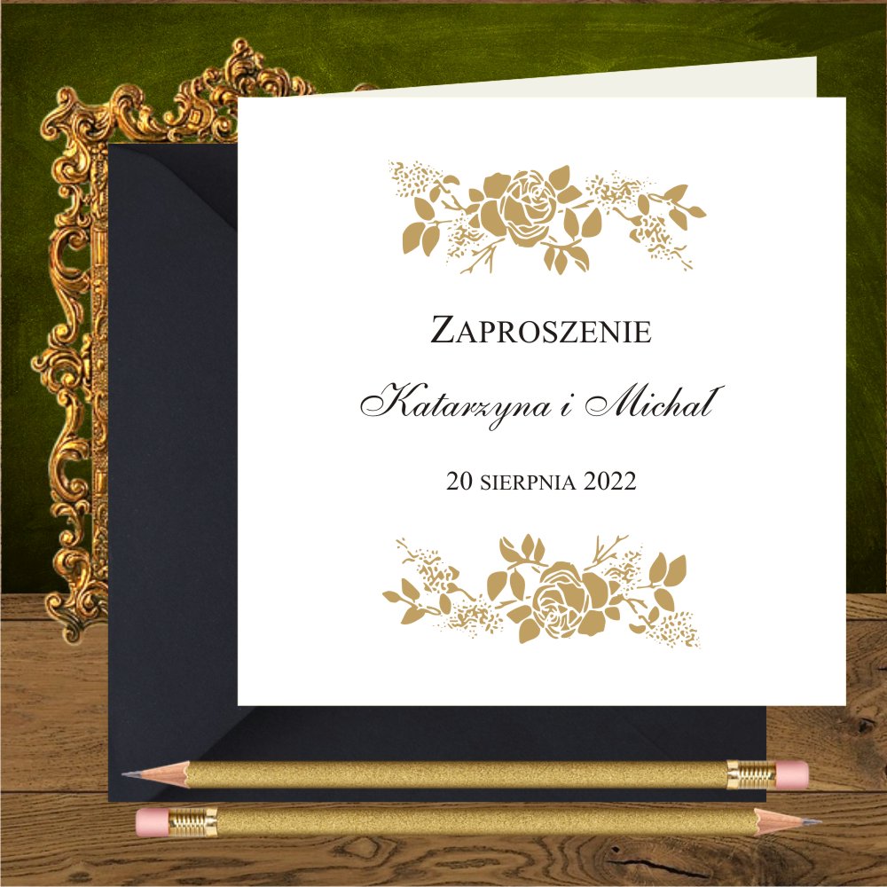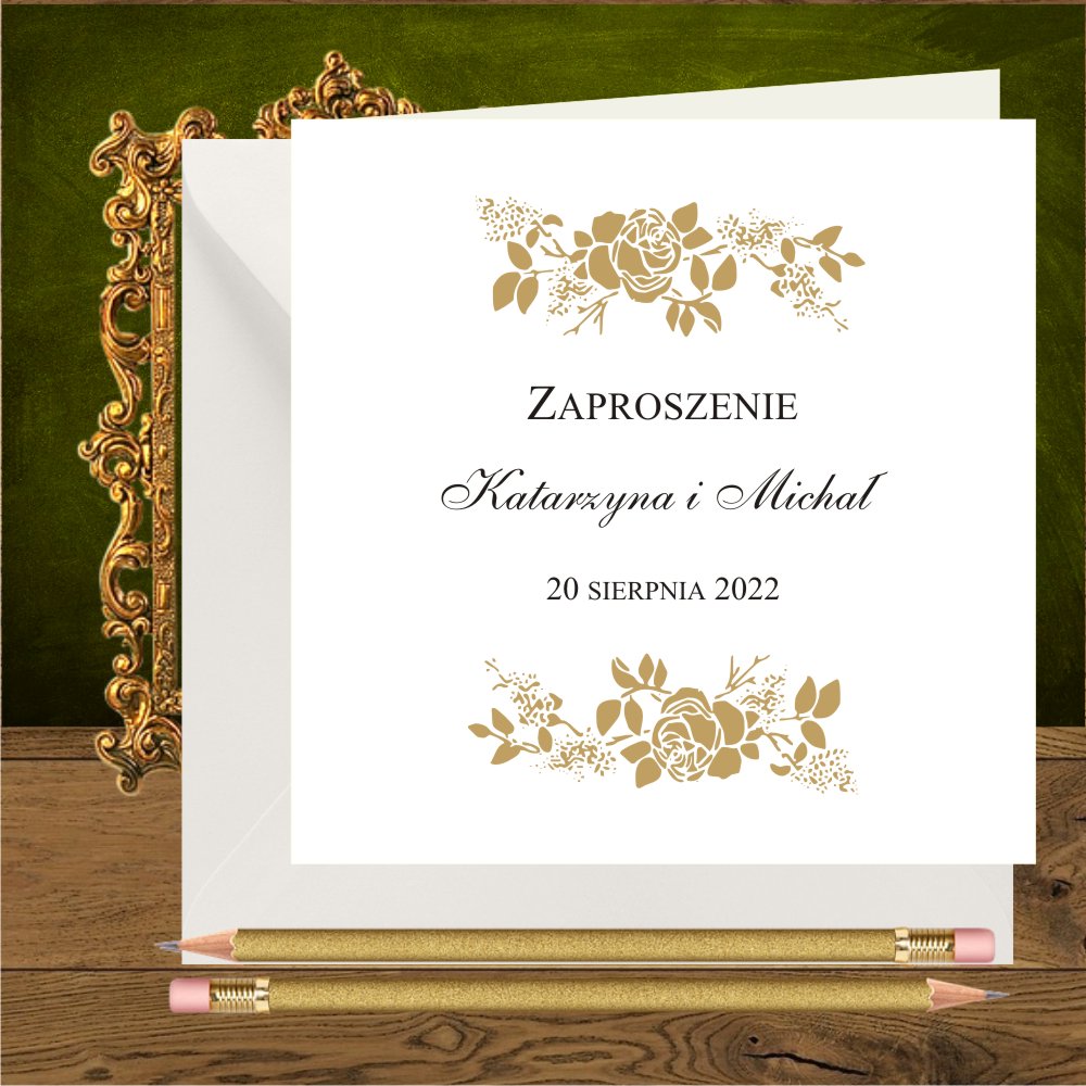 Zaproszenia na ślub ze złotymi różami. Proste, kwadratowe. Róże złote