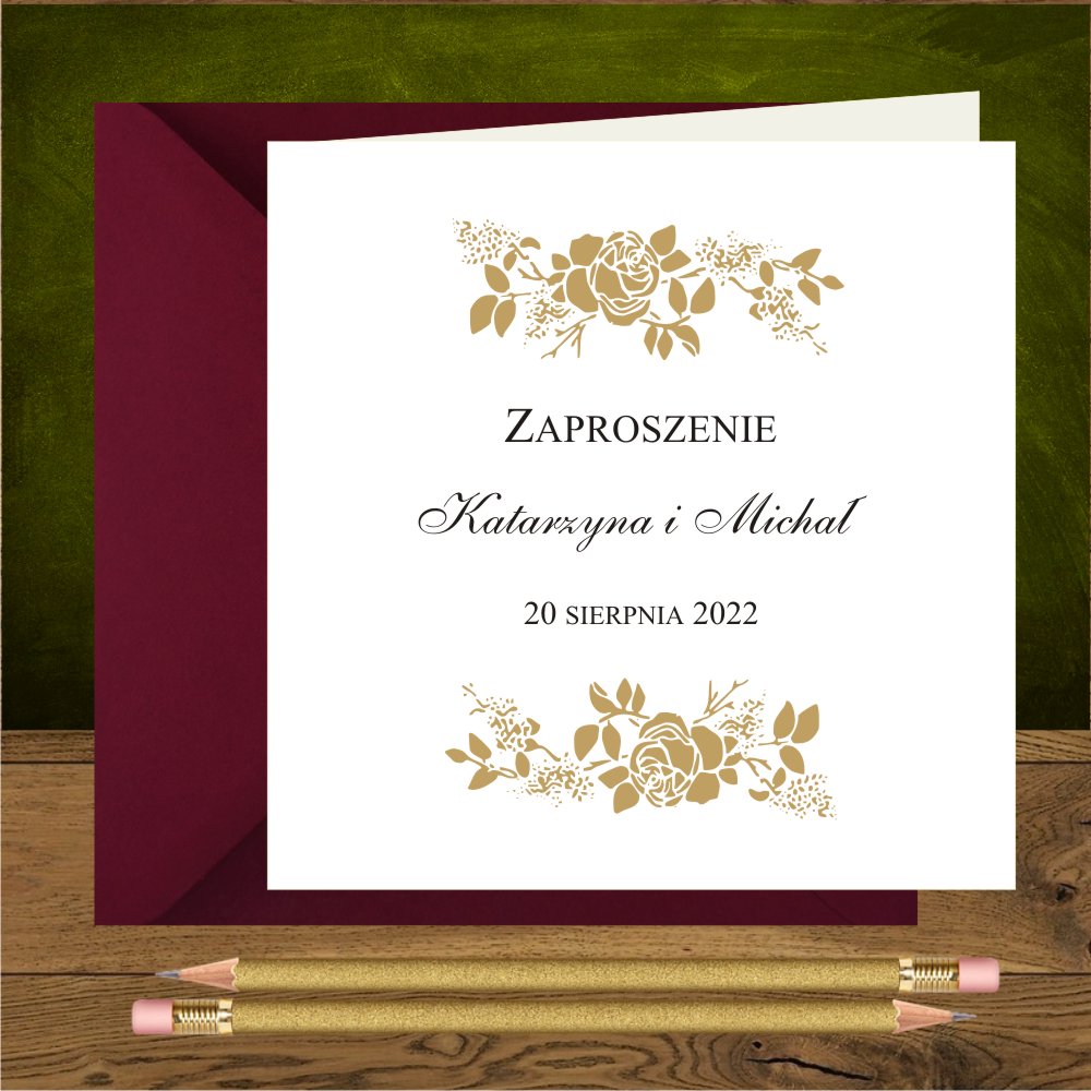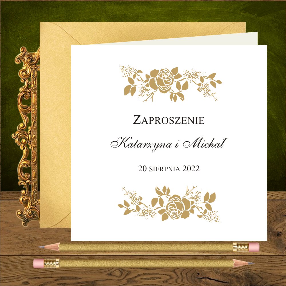 Zaproszenia na ślub ze złotymi różami, proste, kwadratowe. Złote róże