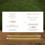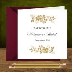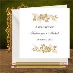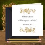 Opis: zaproszenie wykonane z bialego papieru. Na okladce złote róże. Wzór idealny dla romantycznych par.