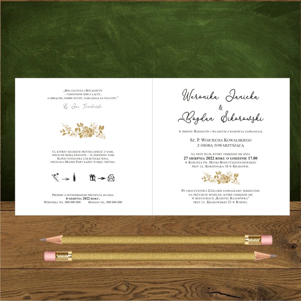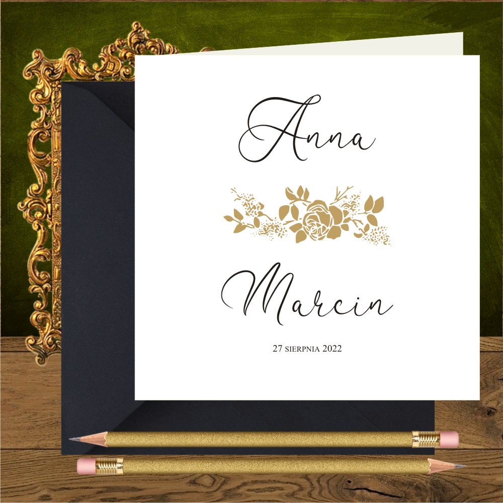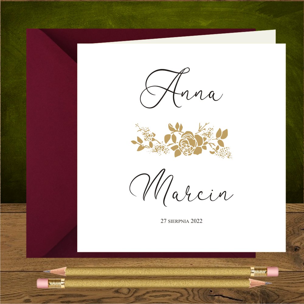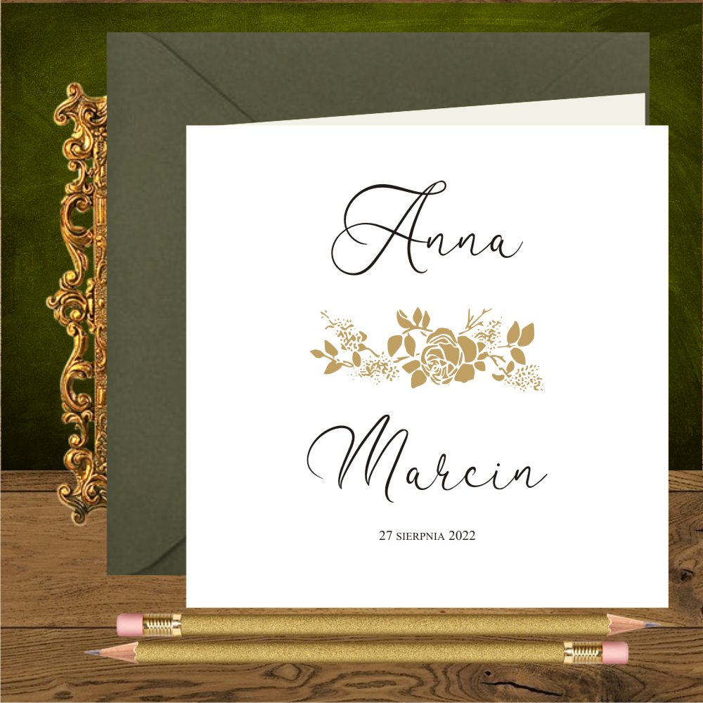 Zaproszenia na ślub ze złotymi różami, proste, kwadratowe. Złote róże