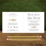 Eleganckie zaproszenia ze złotem w grafice, zawsze aktualny, klasyczny motyw ślubny to róże, które pięknie prezentują się na dodatkach. Winietki ze złotymi różami, róże na menu czy na pudełkach na ciasto to zawsze aktualna klasyka na ślubach. Czasem chcecie nawet rok wczesniej poinformować o ceremonii, wystarczy wysłać pocztą zawiadomienia ślubne, poprzedzające zaproszenia docelowe. Ważne żeby były w tej samej stylistyce, te ze złotymi różami będą idealne.