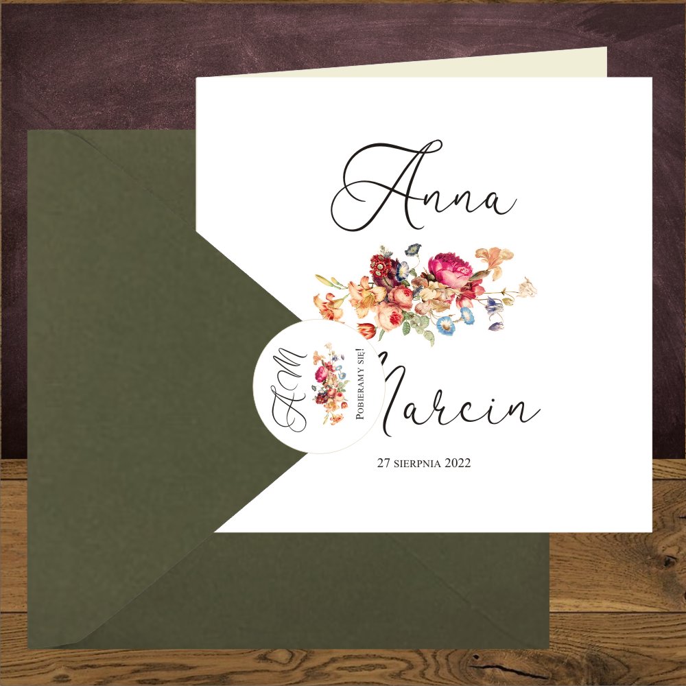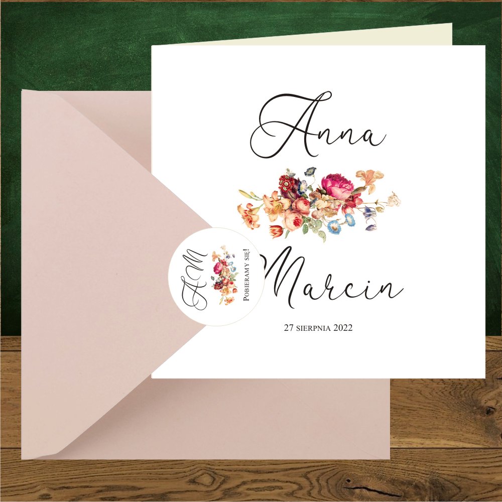 Zaproszenie na ślub w stylu boho, kwiaty w bukiecie łączą nowoczesność z tradycją. Kolory bordo, delikatny błękit, zgaszona zieleń nawiązują do natury, co odzwierciedla luźna kompozycja wiązanki we wzorze. Zaproszenia są wykonane z pięknego aksamitnego papieru. Niebanalna czcionka nadaje zaproszeniom stylu. Do wyboru koperty w kolorze pastelowego różu, różowy nude, biała, ecru, złota, bordo. Szczególnie pięknie prezentuje się z koperta bordo i złota. Zaproszenie może być personalizowane w środku lub na kopercie. Na odwrocie zaproszenia ślubnego mamy subtelny monogram.
