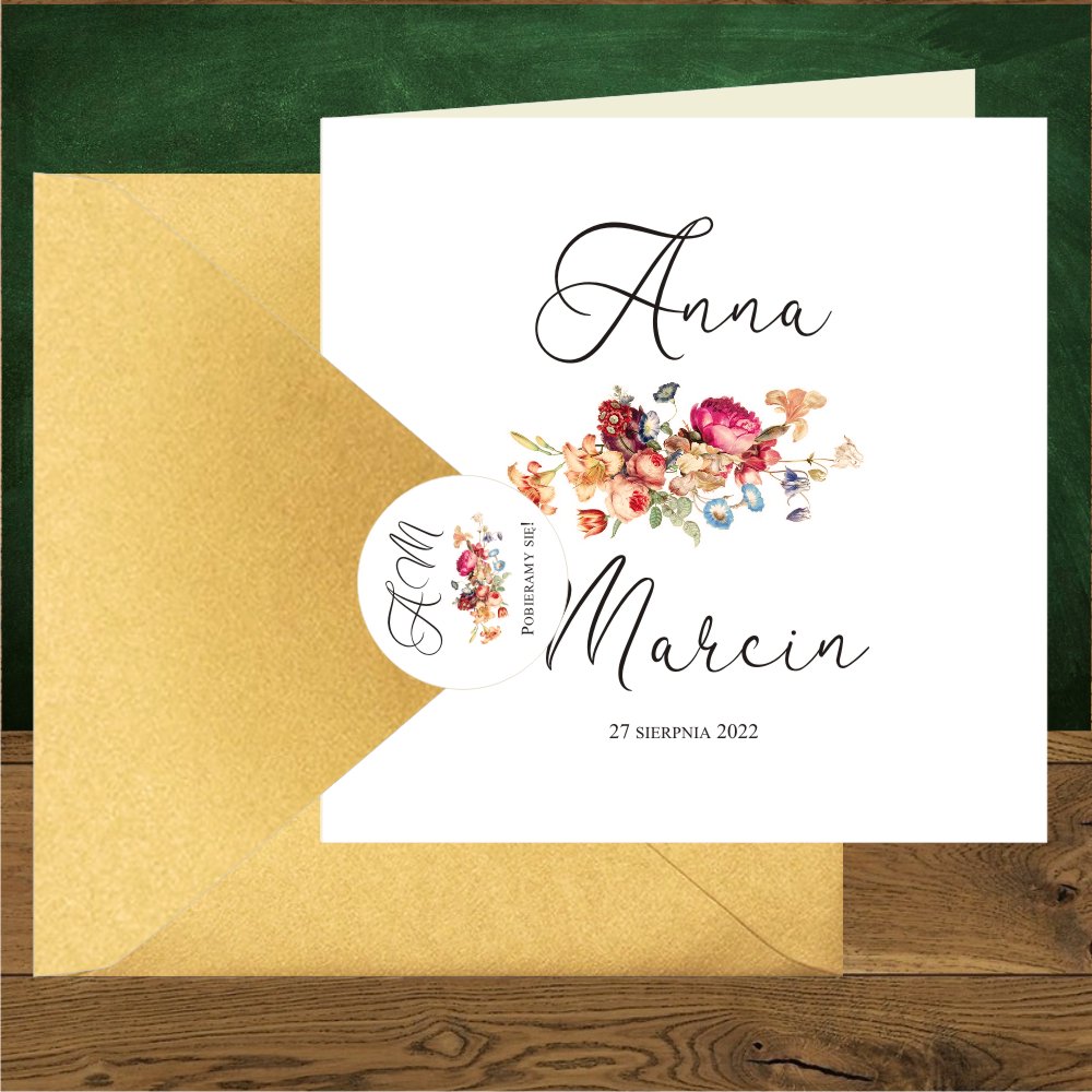 Zaproszenia ślubne Angielskie róże retro flanella - fantazyjne. Kwadratowe złoty kartonik