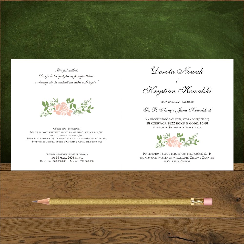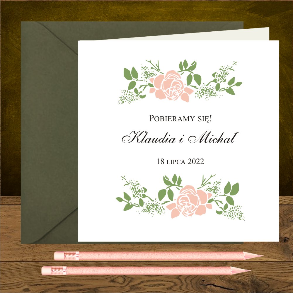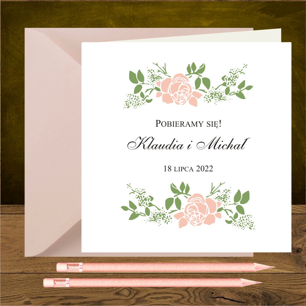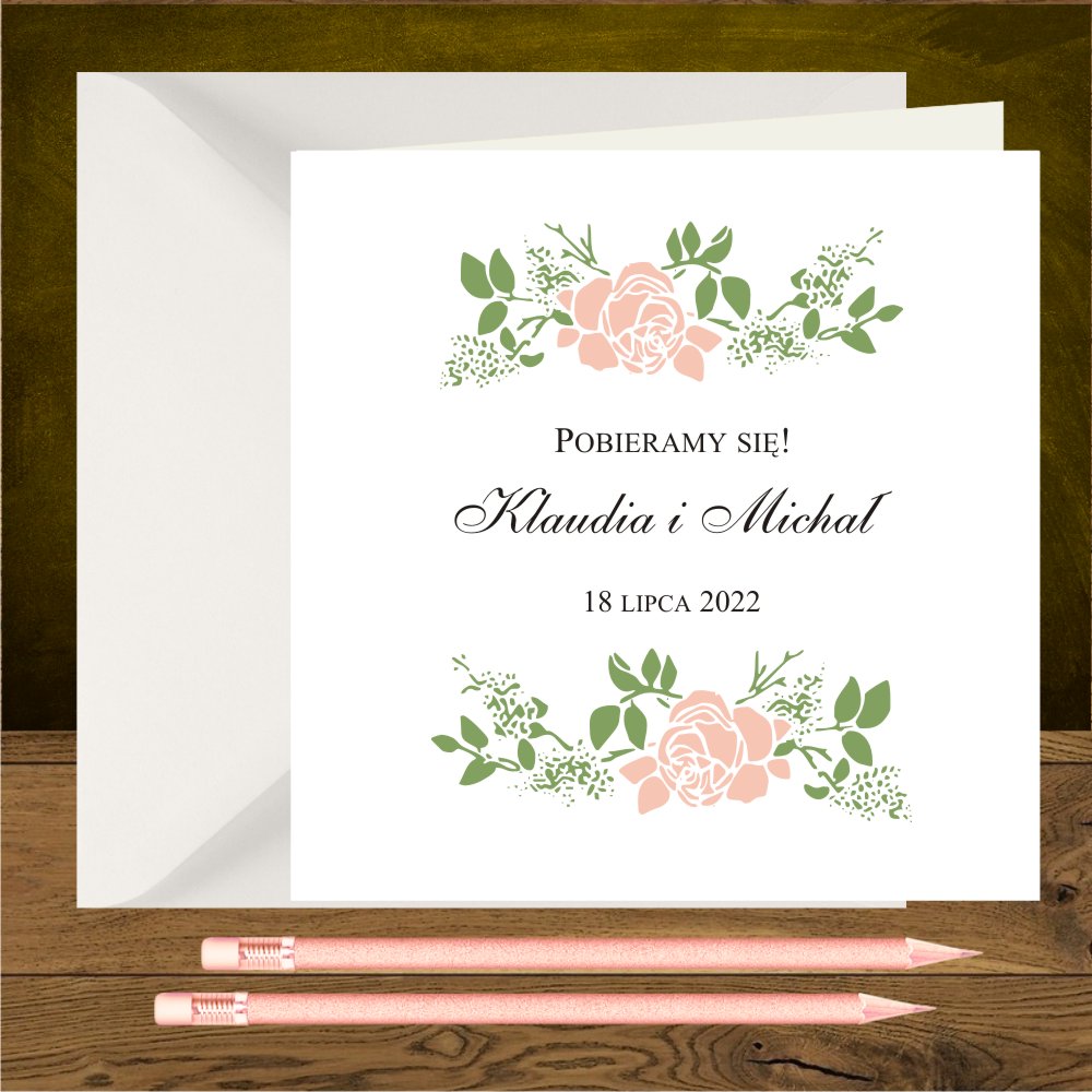 Zaproszenia ślubne kwiatowe. Róże łososiowe i zielone listki