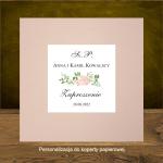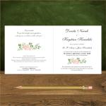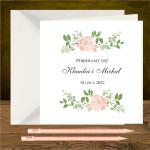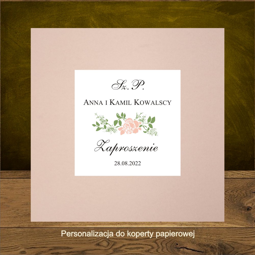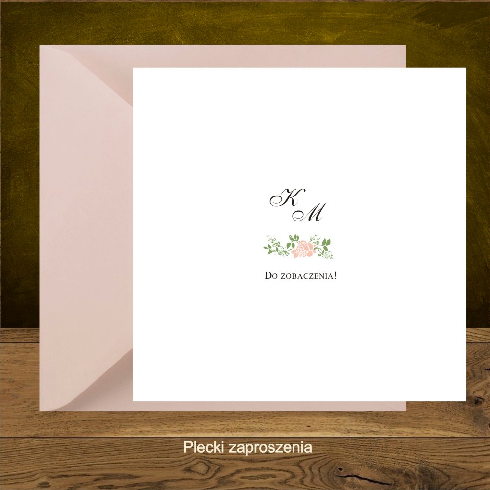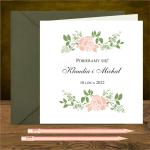 Opis: zaproszenia wykonane z papieru białego. Na froncie różowe kwiaty z zielonymi listami. Zaproszenie w stylu bogo, rustykalnym.