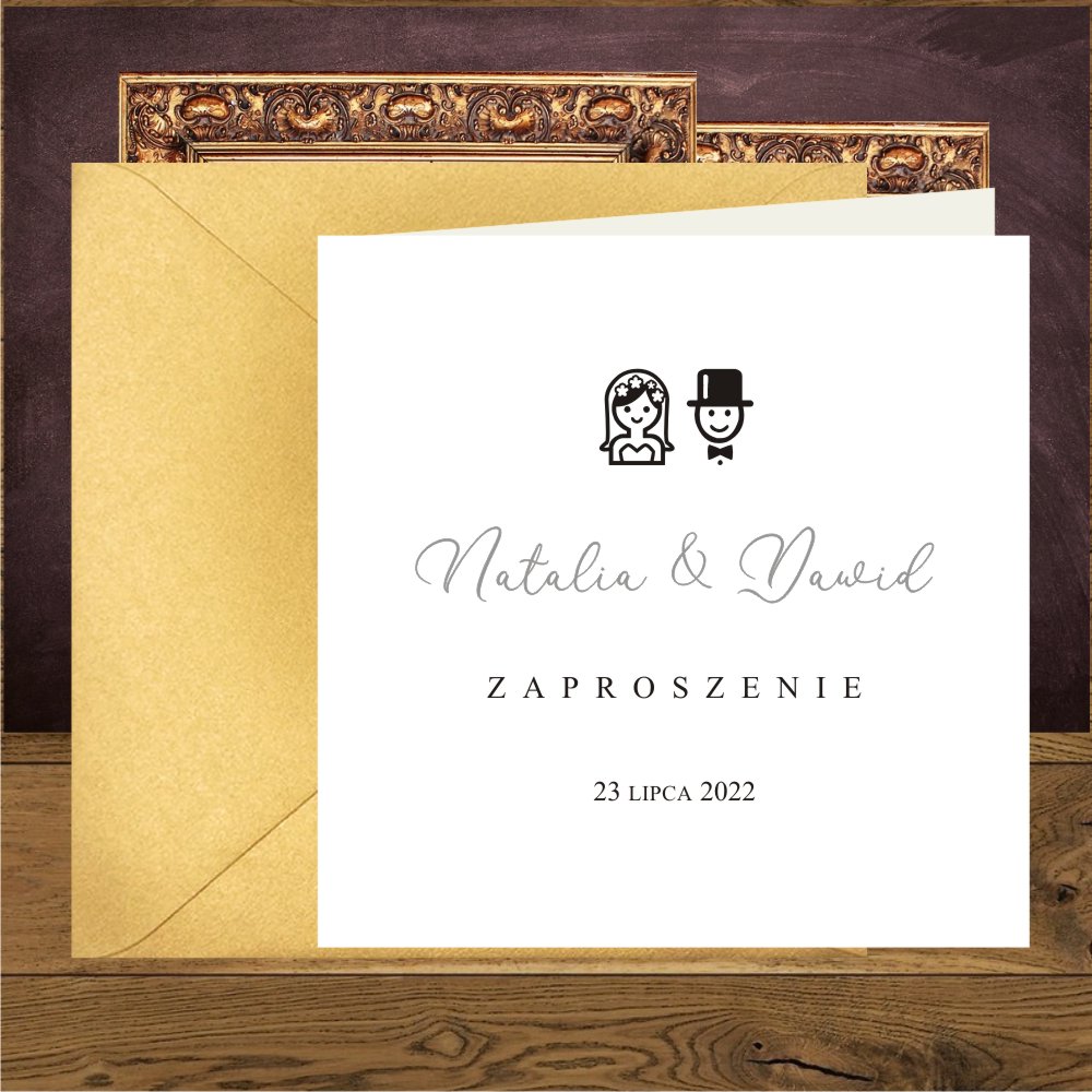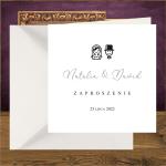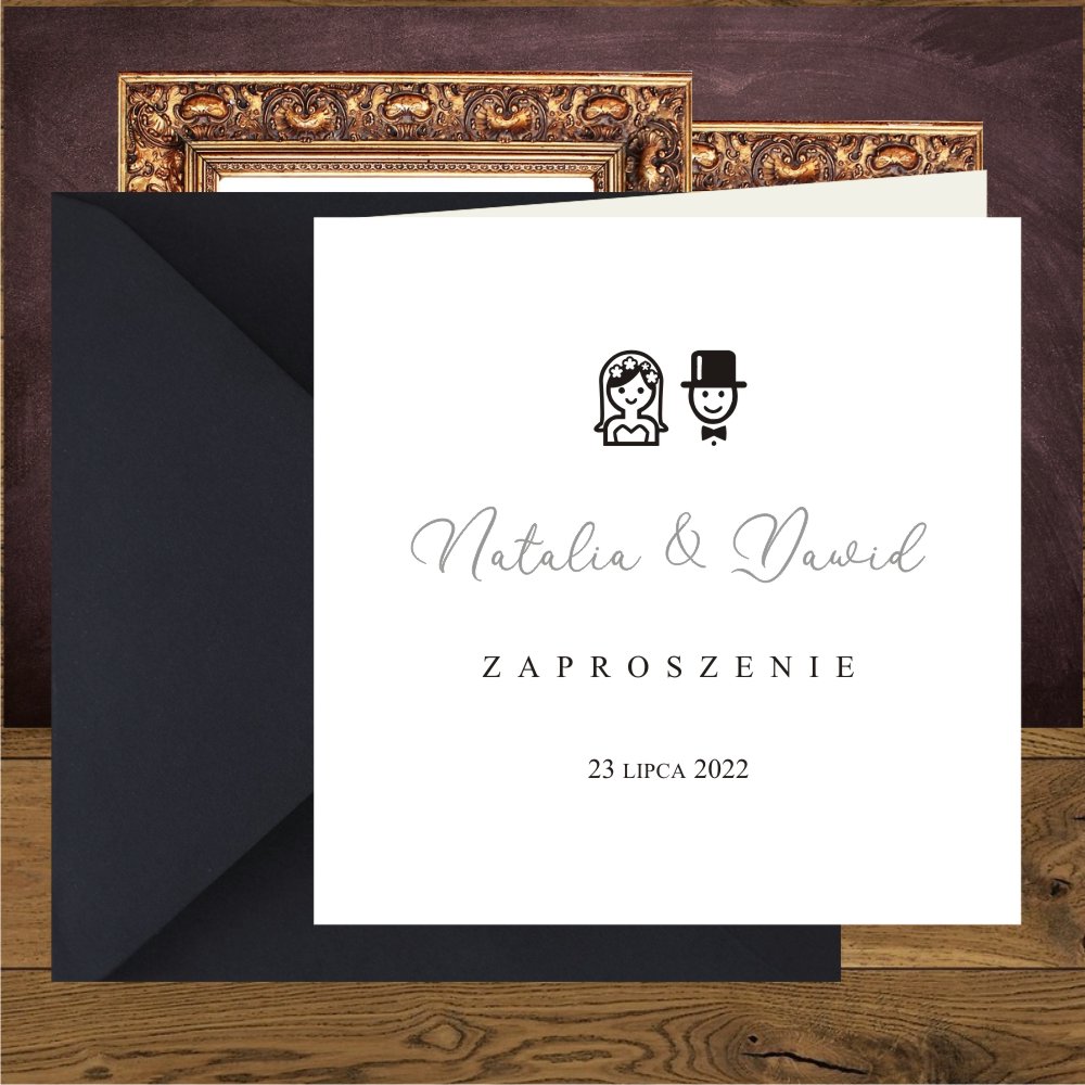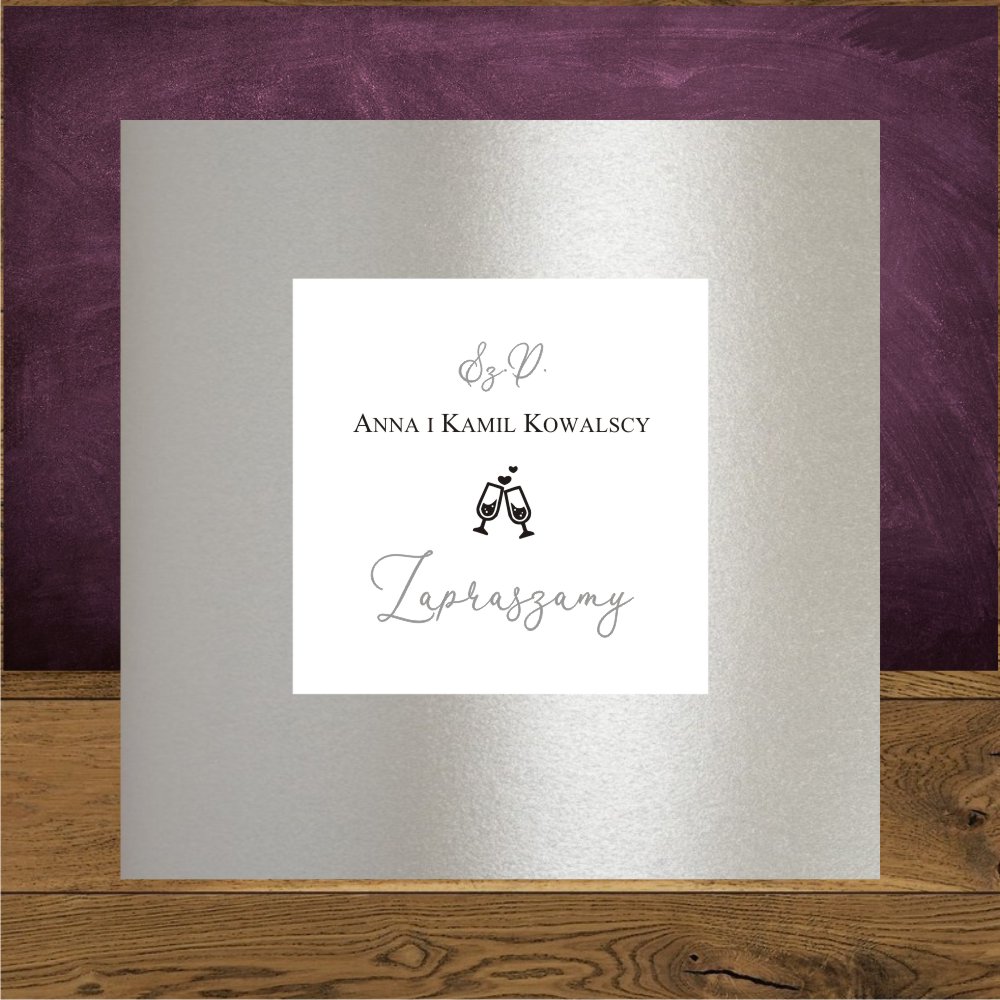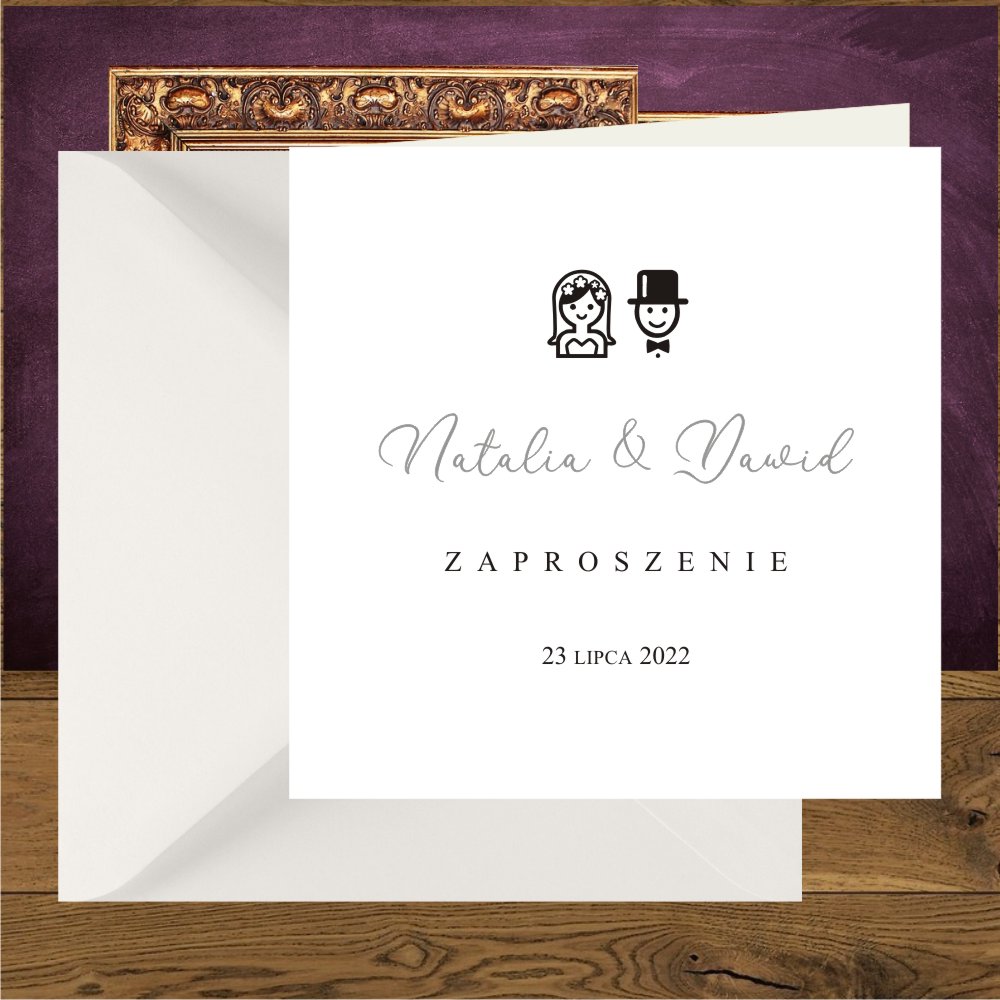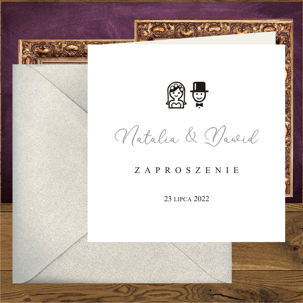 Zaproszenia ślubne minimalistyczne, proste z Parą Młodą. Wedding srebro