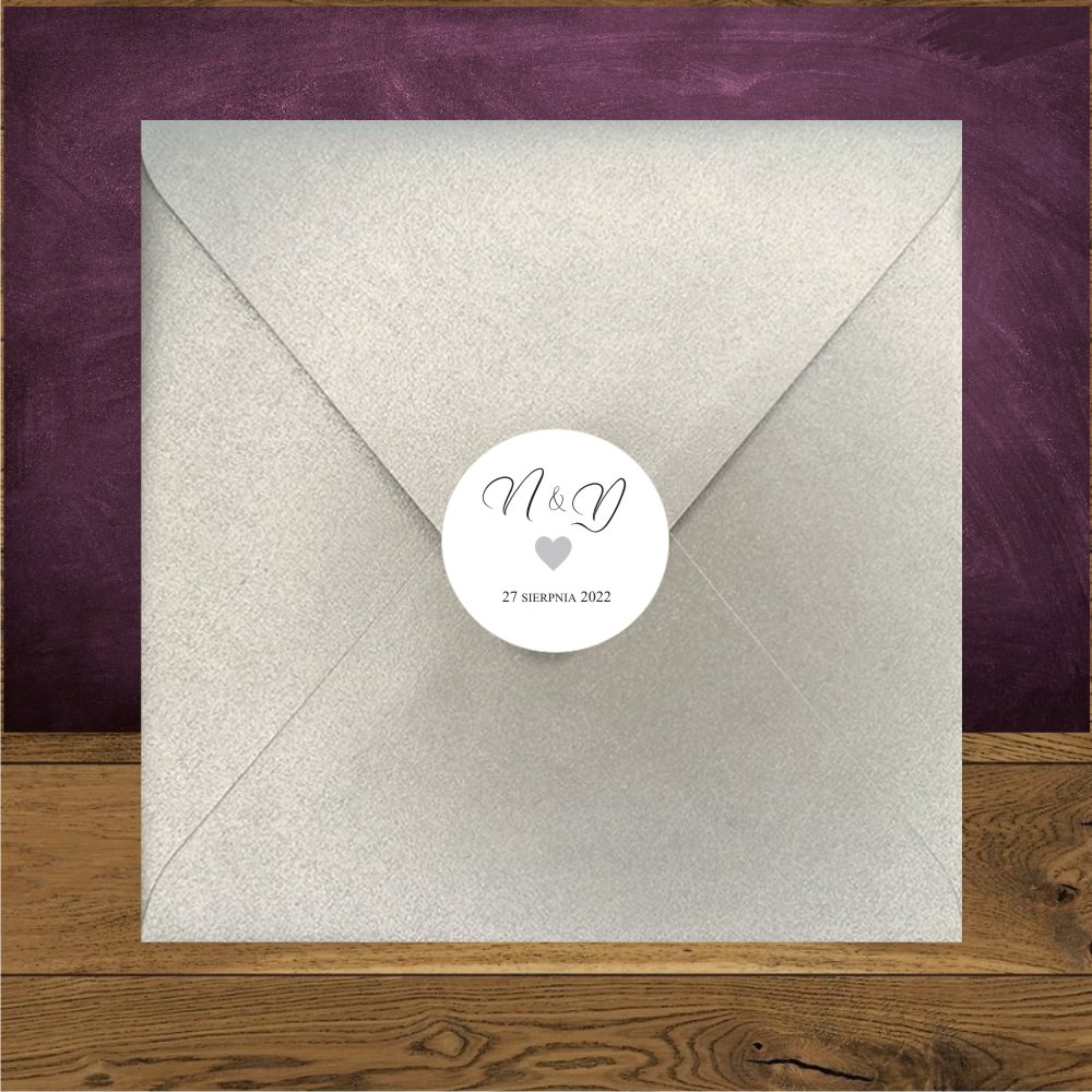 Naklejka na kopertę w kształcie kółeczka ze srebrnym serduszkiem wykonana z papieru takiego jak użyty w zaproszeniach |