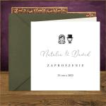 Zaproszenie na ślub jest w kolorystyce białej z czarnym i szarym nadrukiem, dlatego cudownie sprawdzi się koperta srebrna metalizowana. Dopełnieniem będzie okrągła naklejka na kopertę ze śmieszną grafiką i personalizacja nazwisk na papierze takim jak w zaproszeniu też z zabawnym motywem.