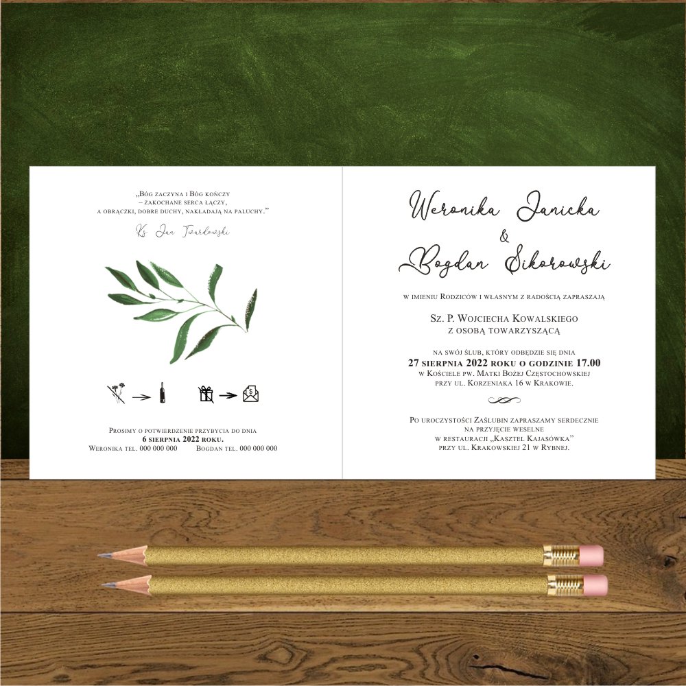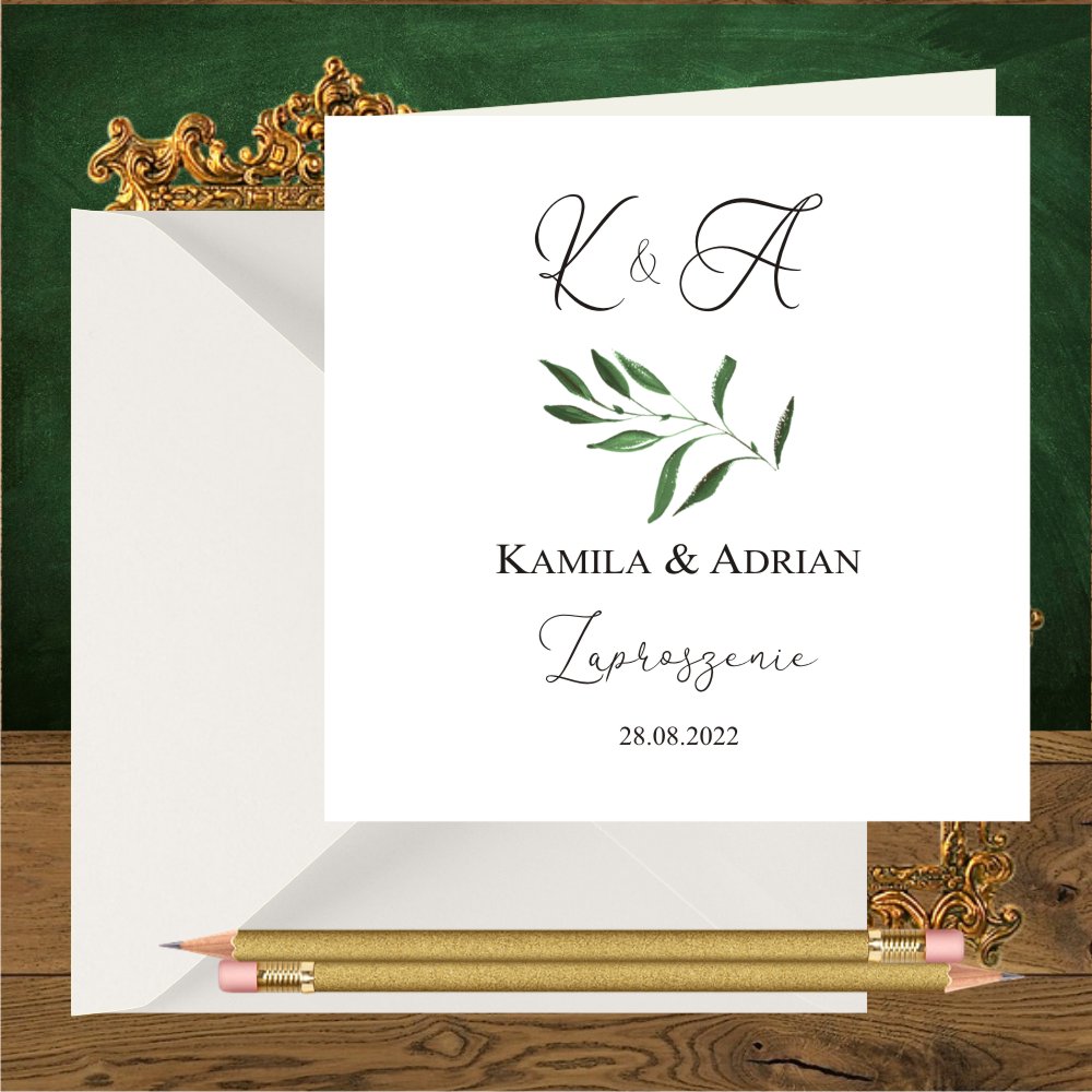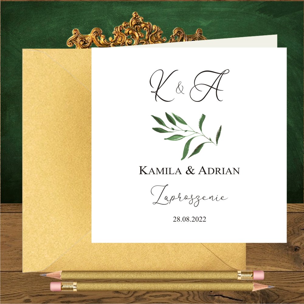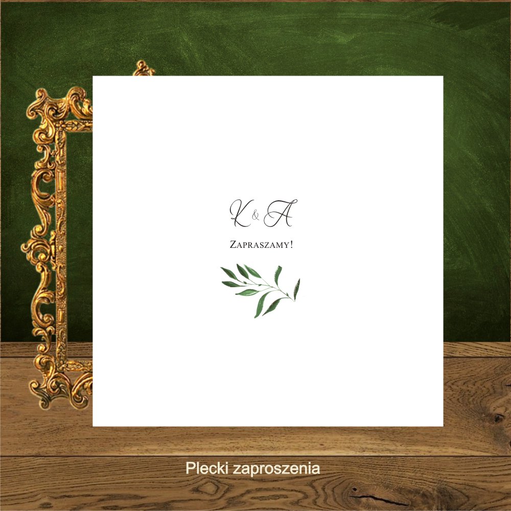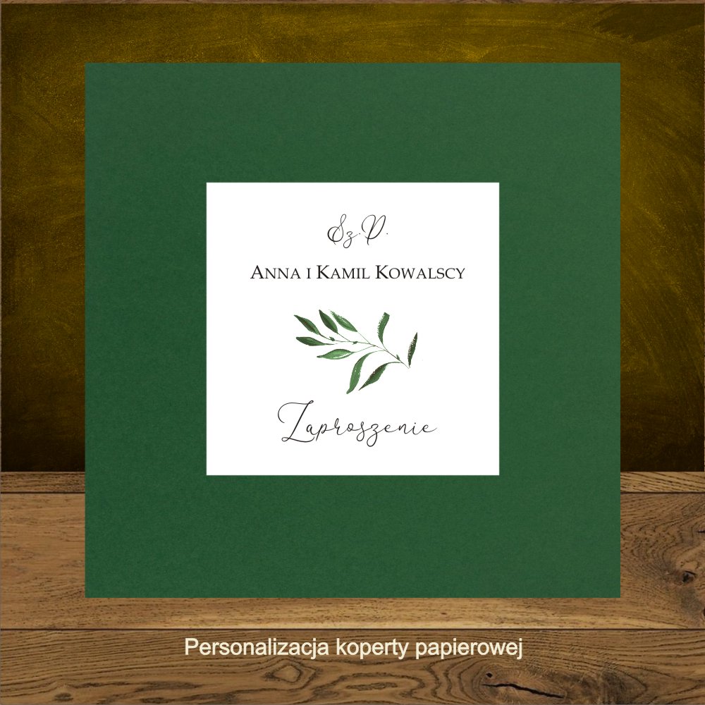 Zaproszenia ślubne rustykalne z zielonymi gałązkami. Kwadratowe proste. Fantazyjna czcionka. Zielone galązki delikatne
