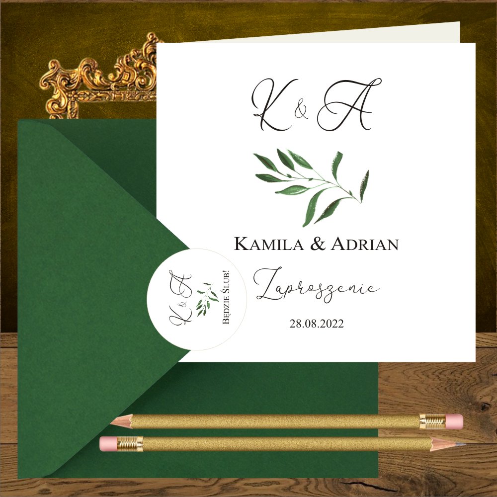 Zaproszenie na ślub w stylistyce rustykalnej. Na okładce grafika zielonej gałązki malowanej akwarelą, inicjały Nowożeńców piękną fantacyjną czcionką i napis zaproszenie. Wzór prezentuje się najpiękniej z kopertą zieloną lub złotą.