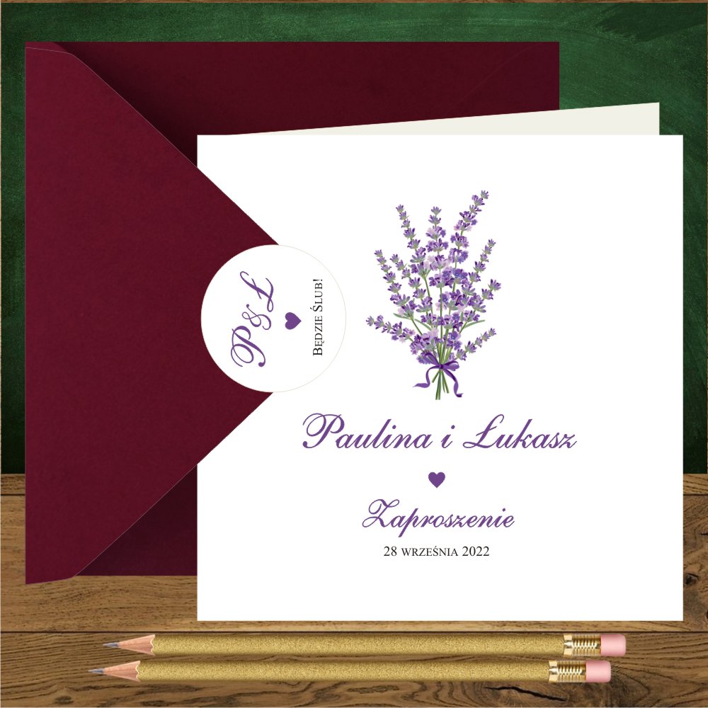 Zaproszenia na ślub z lawendą, koperta z wyklejeniem