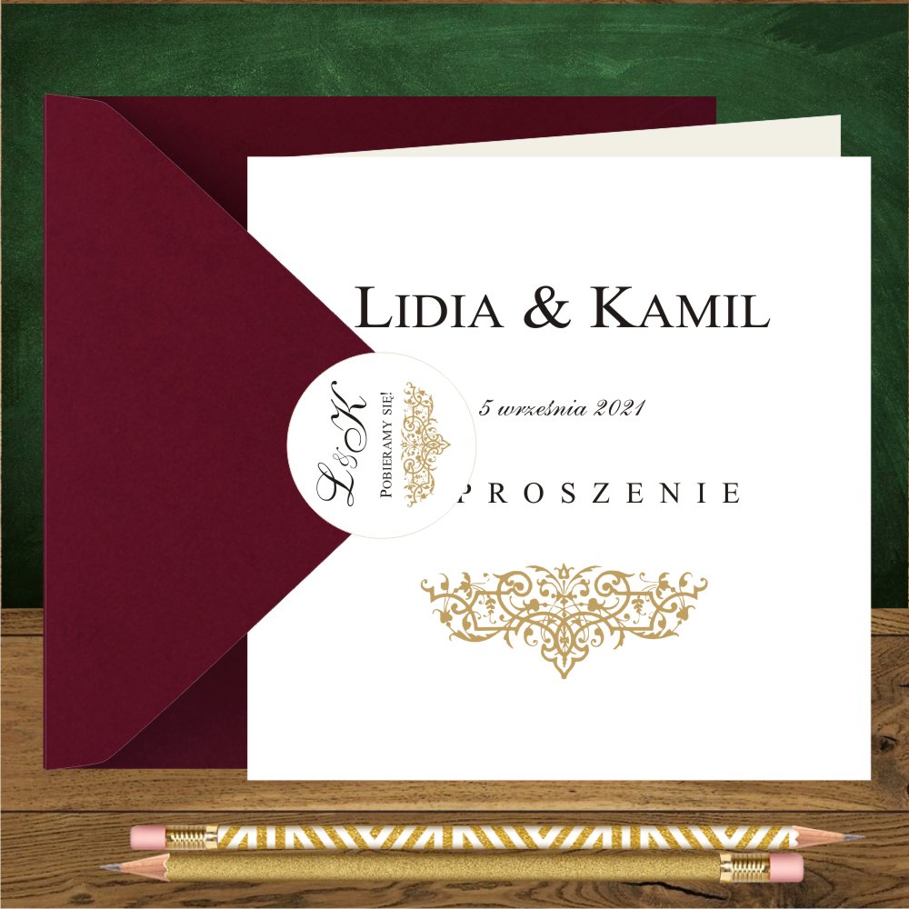 Opis ; Zaproszenie na wesele ze złotym ornamentem, na białym eleganckim papierze. Nowoczesna czcionka. Piękne zaproszenie pasuje prawie do każdej koperty. Dopełnieniem wzoru jest okrągła naklejka na kopertę.