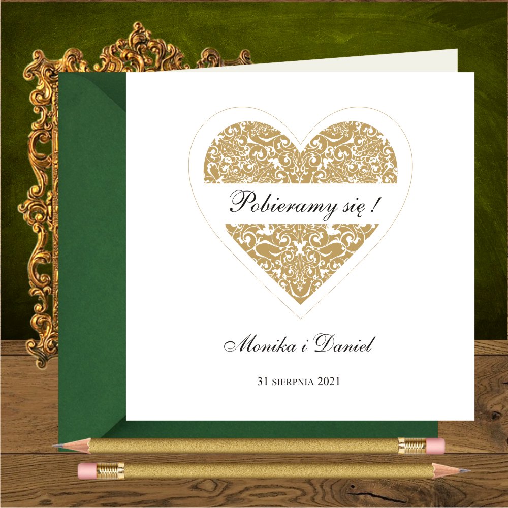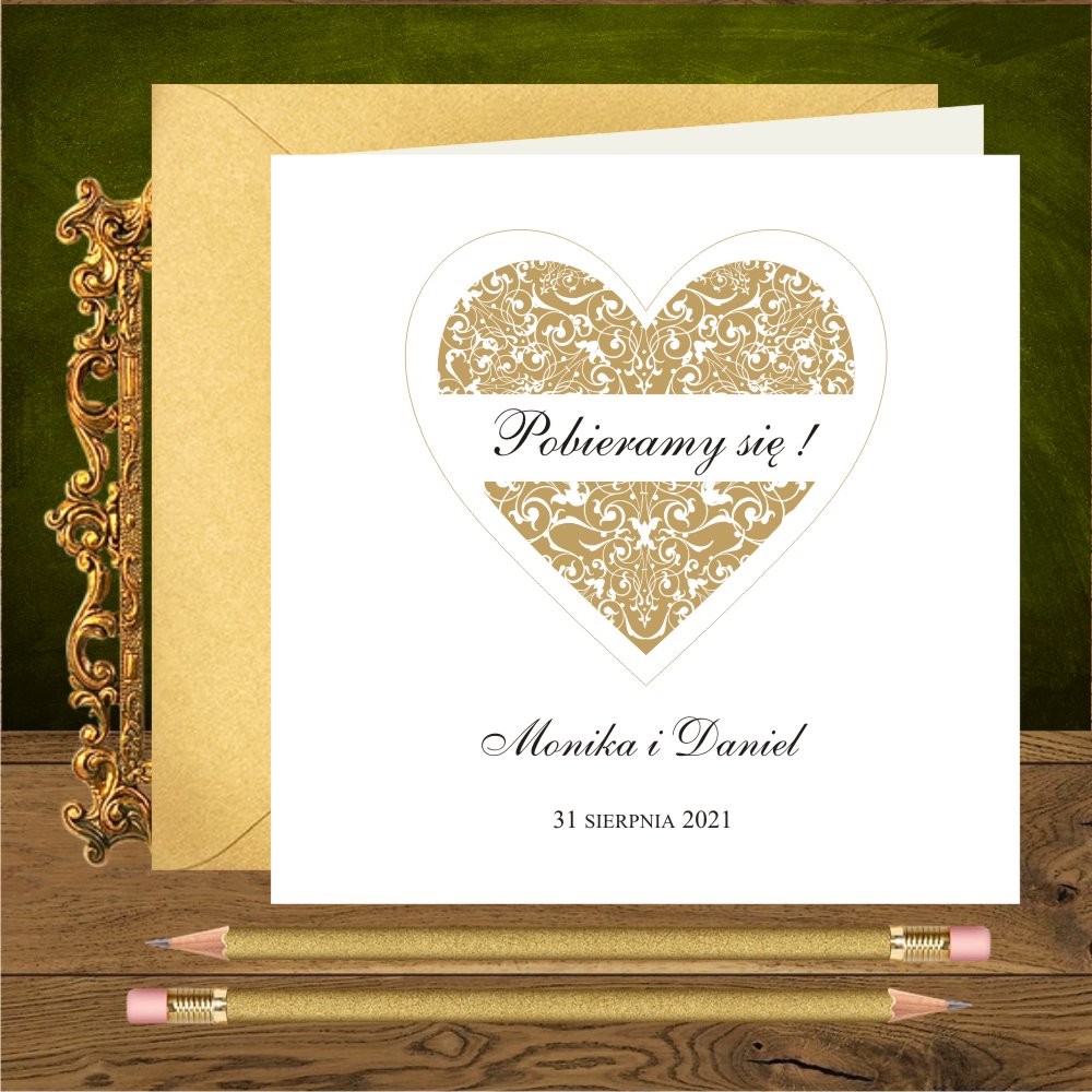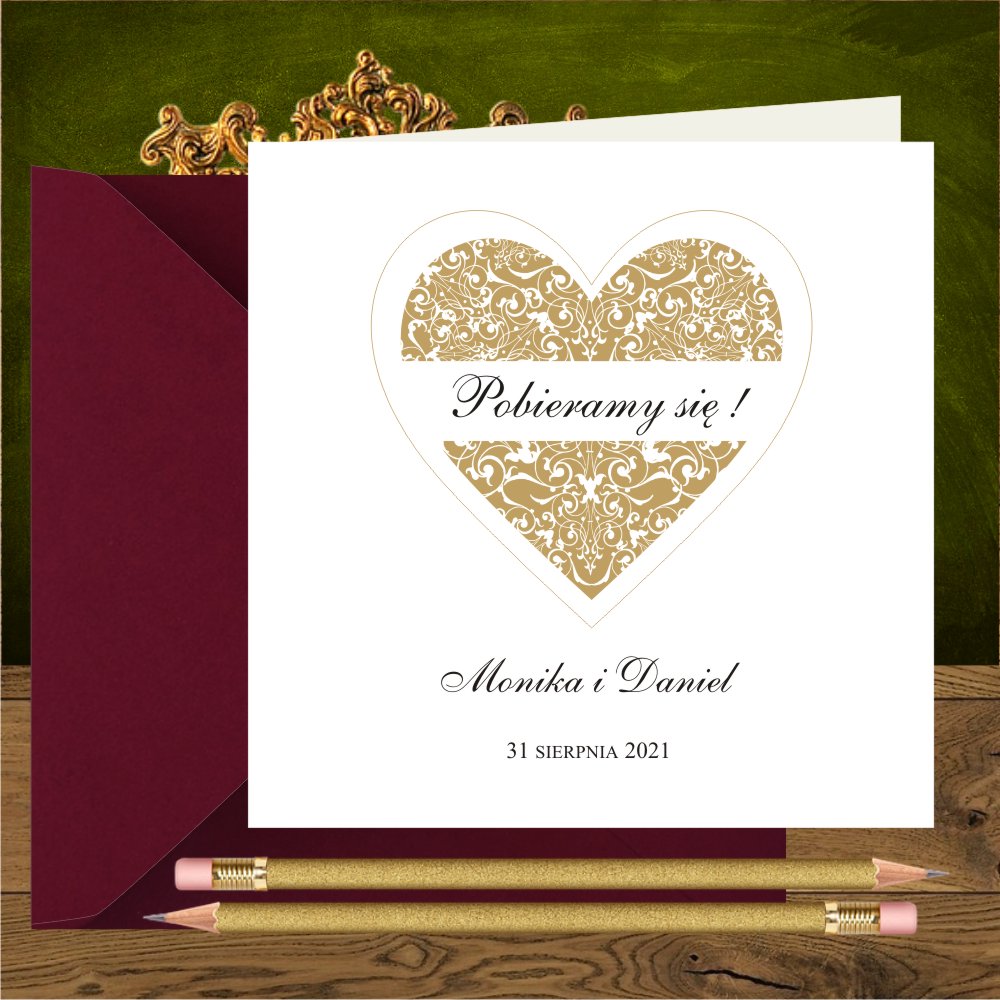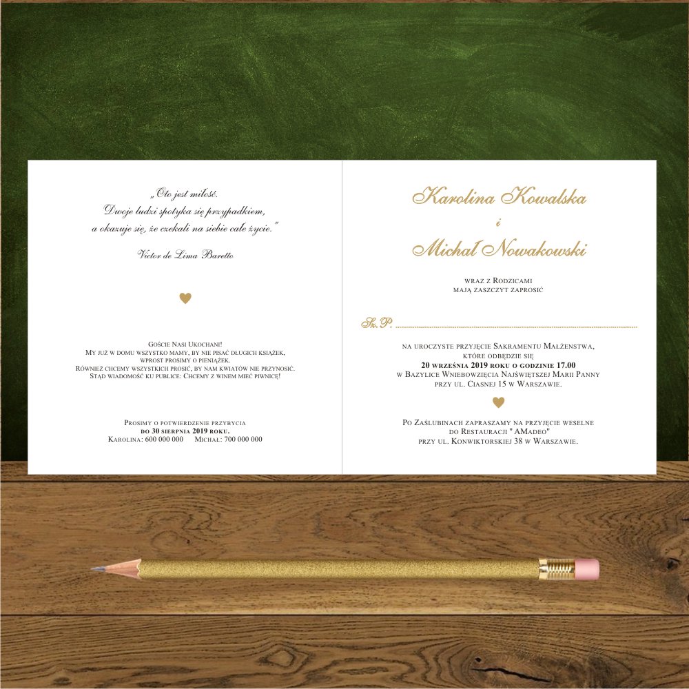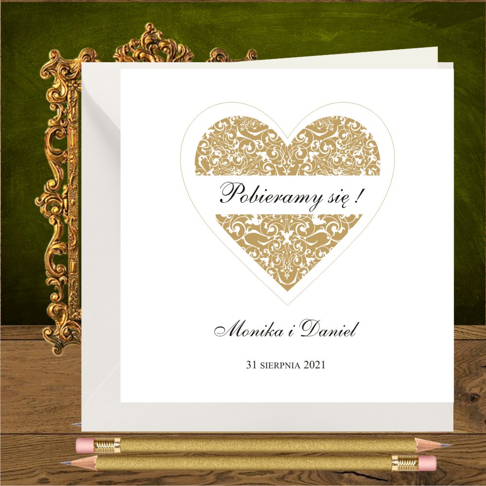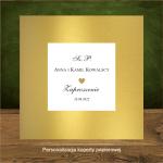 Zaproszenia ślubne z sercem, proste kwadratowe. Serce złote