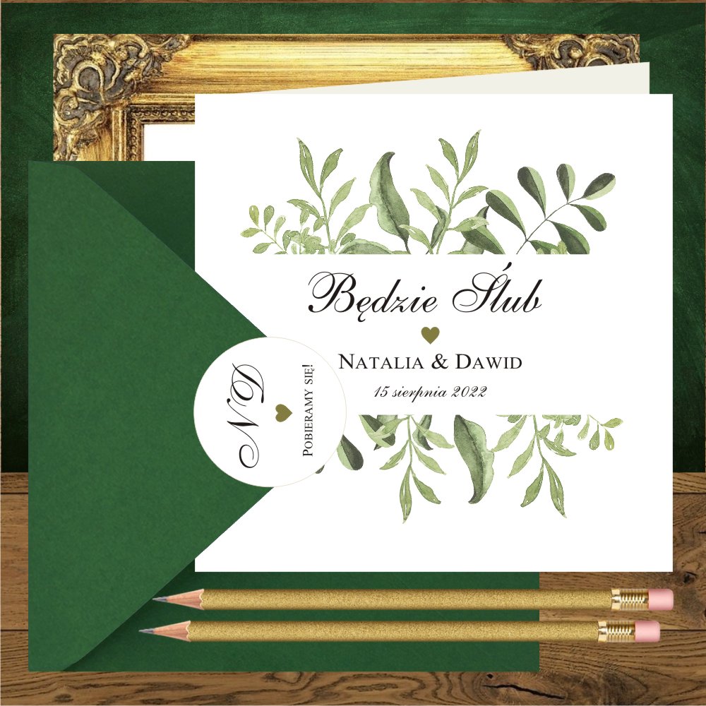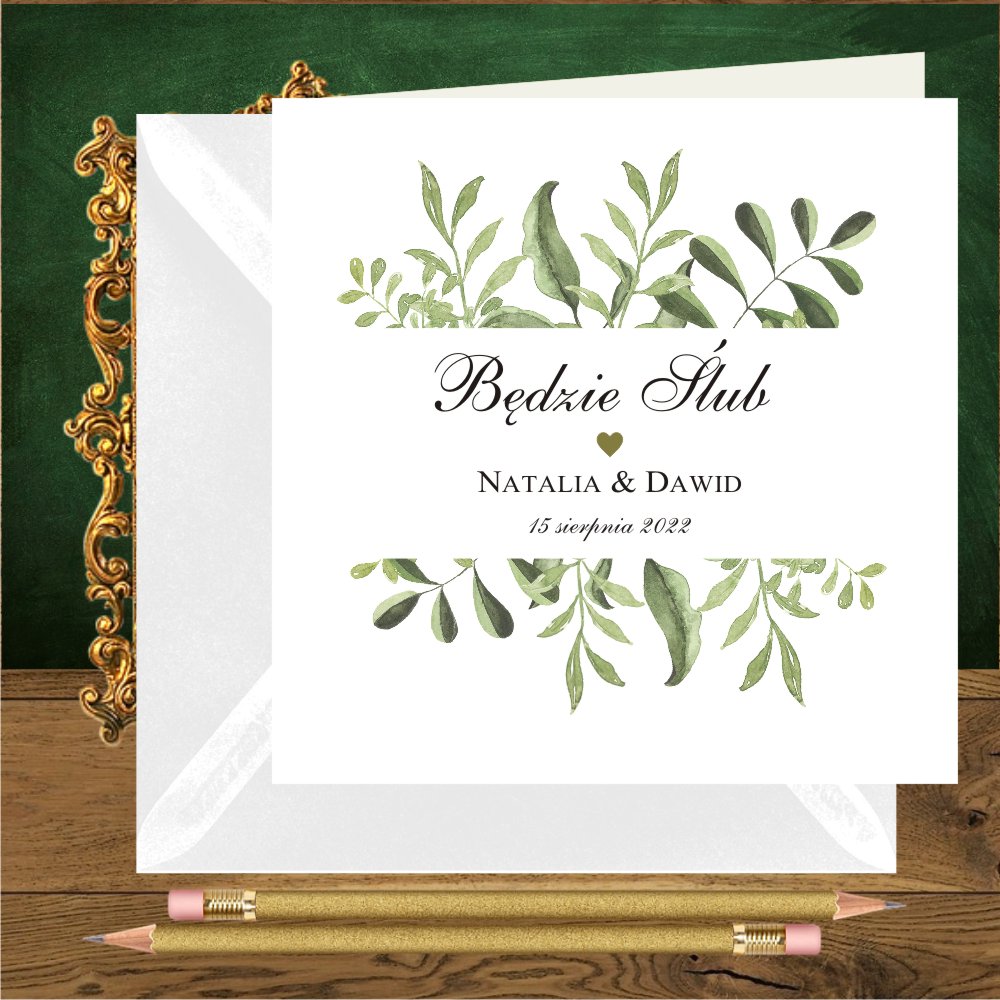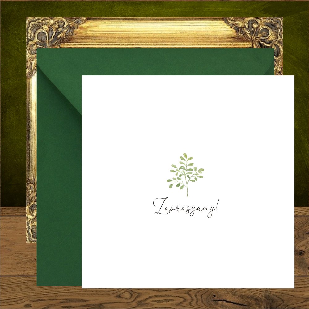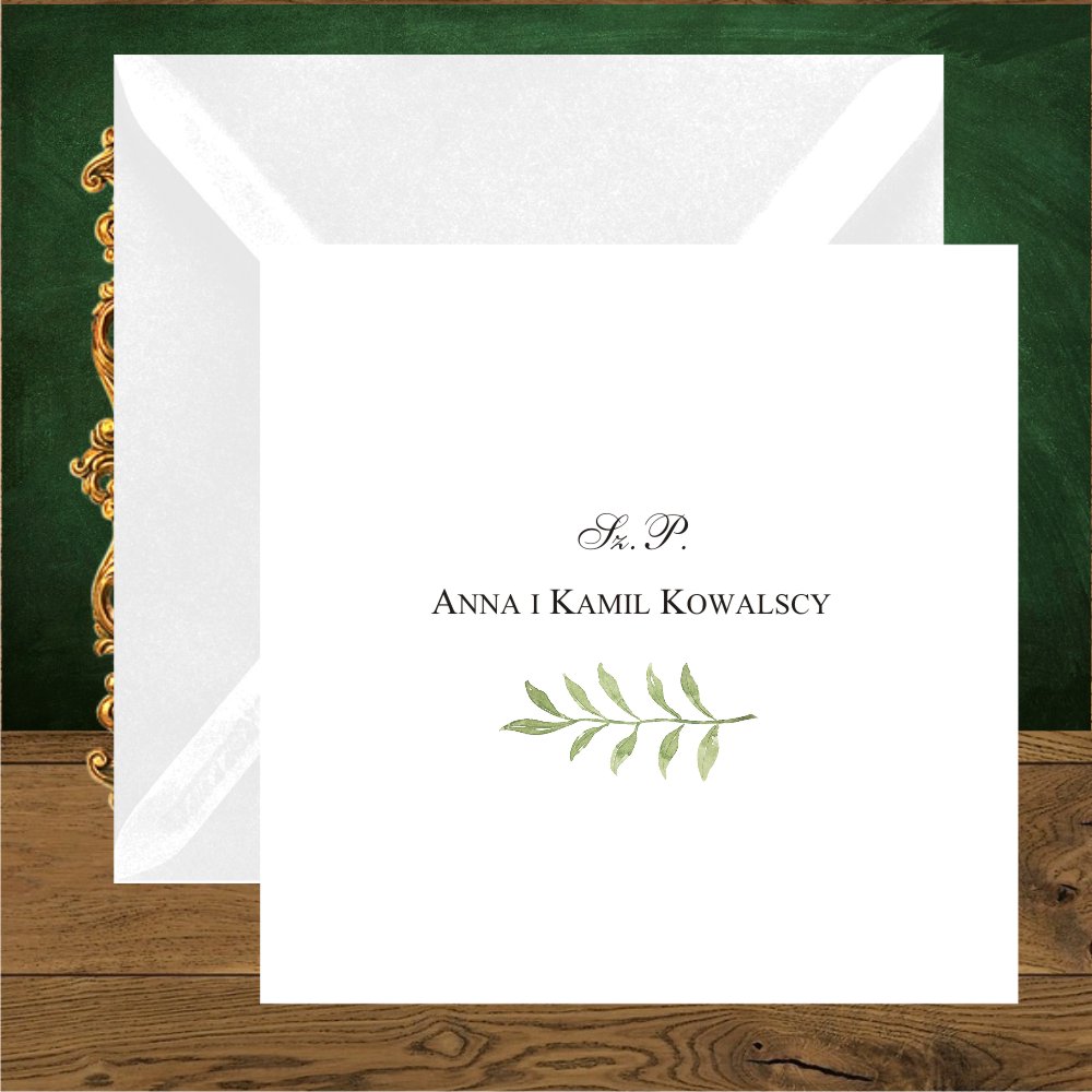 Pudełka na ciasto z zielonymi gałazkami, całą papeterię w tym stylu i piękne zaproszenia na wesele rustykalne, które doskonale wpiszą się w wizję waszego wesela. Nasza propozycja personalizacji zaproszenia to wersja w środku i na pleckach, w przypadku koperty transparentnej, pięknie prześwitującej.