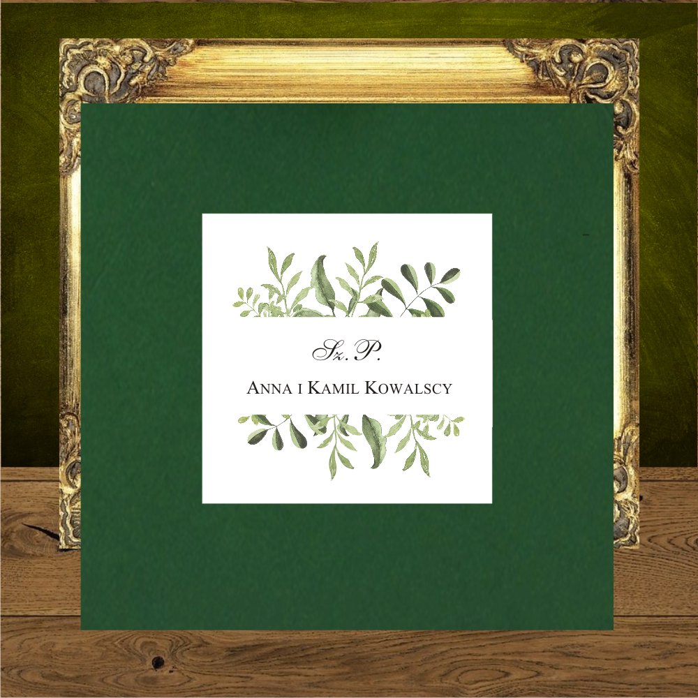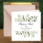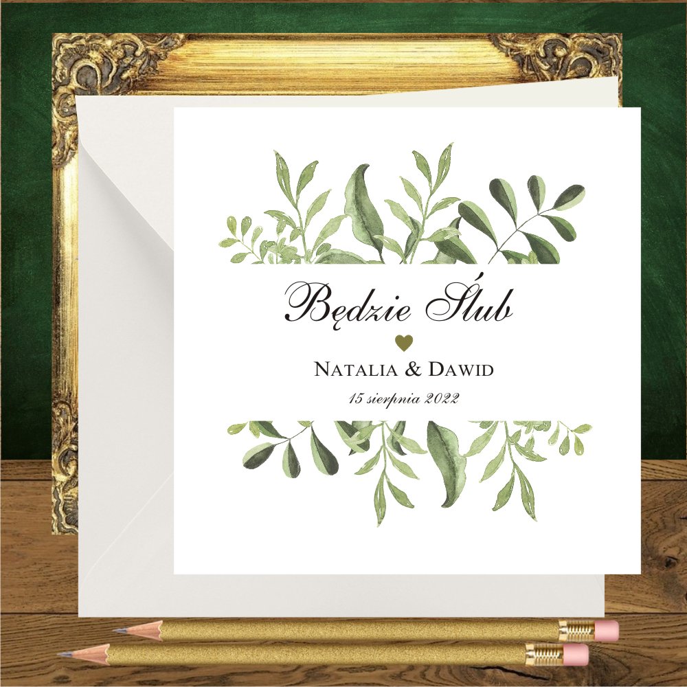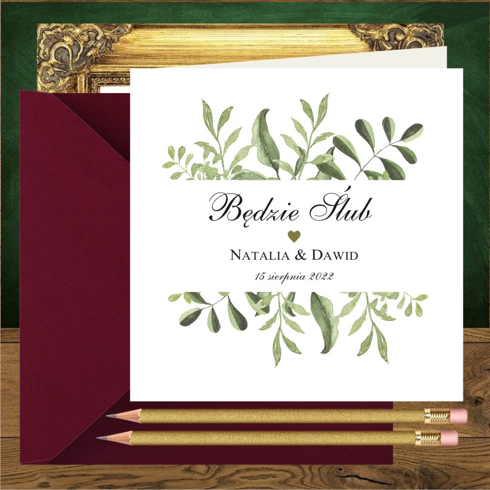 Pudełka na ciasto z zielonymi gałazkami, całą papeterię w tym stylu i piękne zaproszenia na wesele rustykalne, które doskonale wpiszą się w wizję waszego wesela. Nasza propozycja personalizacji zaproszenia to wersja w środku i na pleckach, w przypadku koperty transparentnej, pięknie prześwitującej.