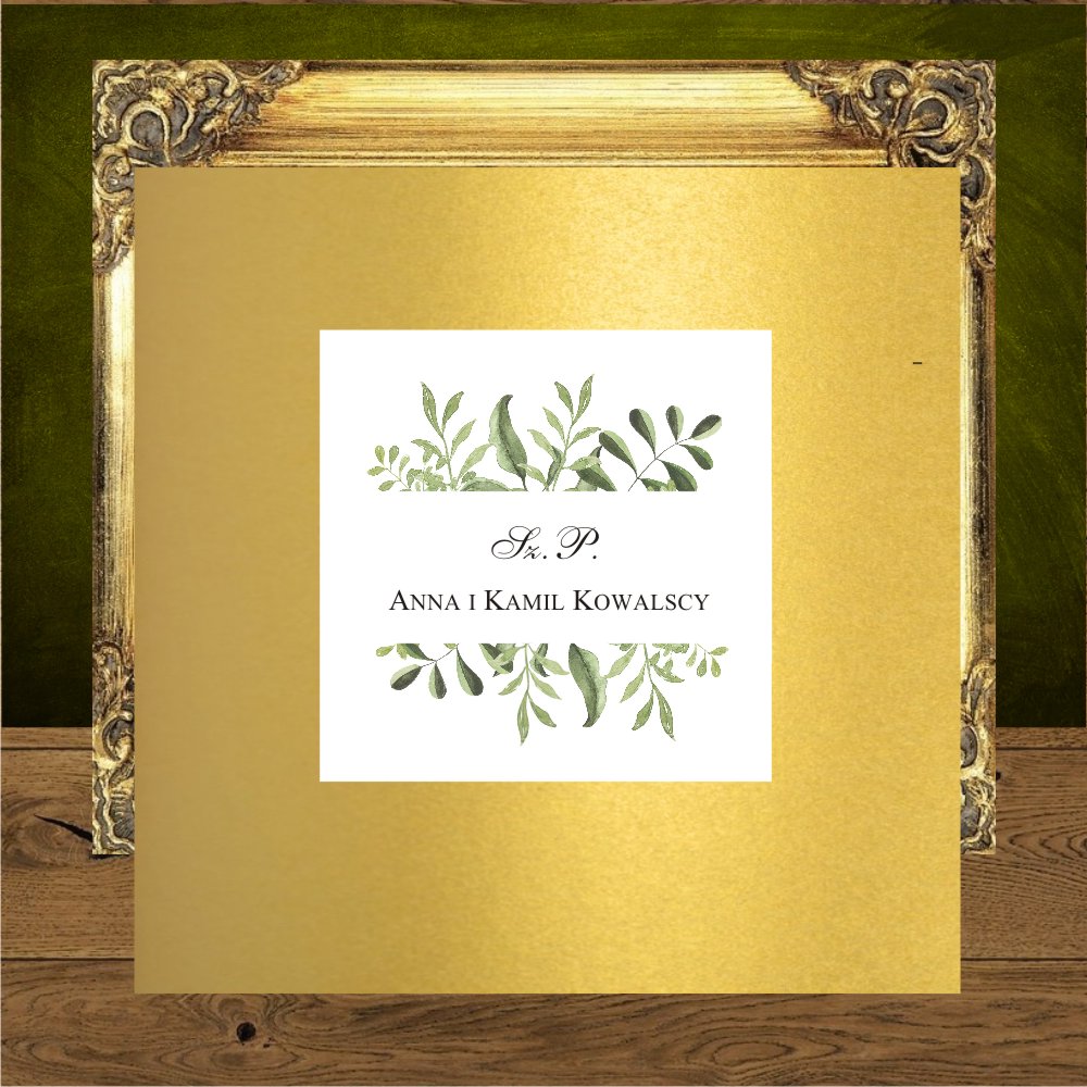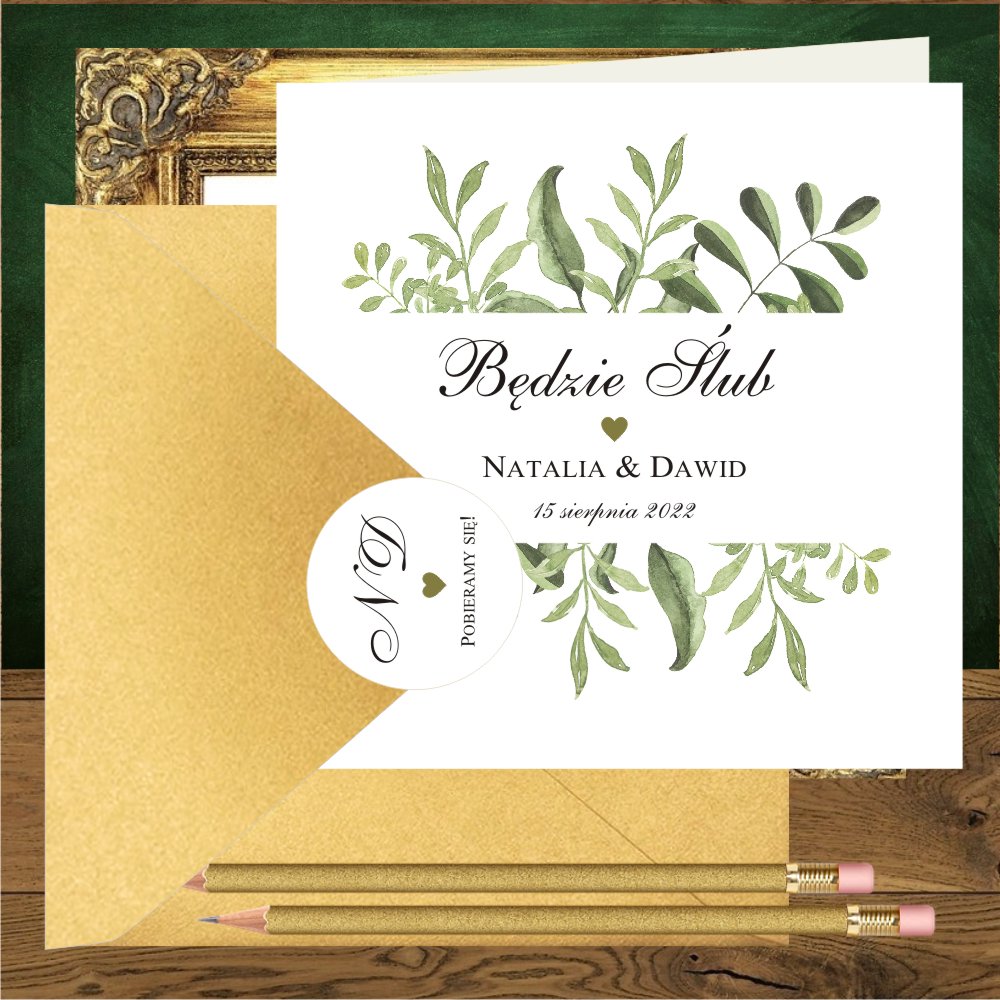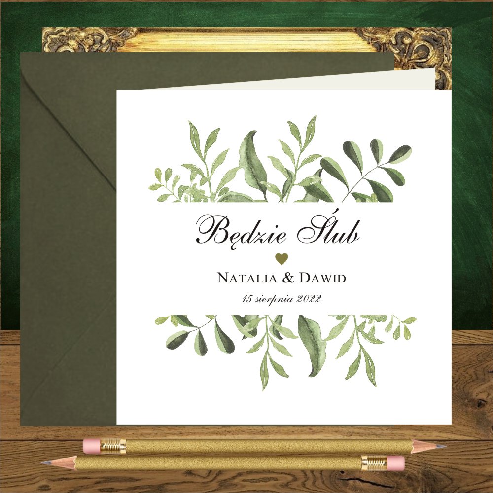Zaproszenia ślubne złoto zielone rustykalne z elementami glamour. Zielone listki i serduszko mini na mirror