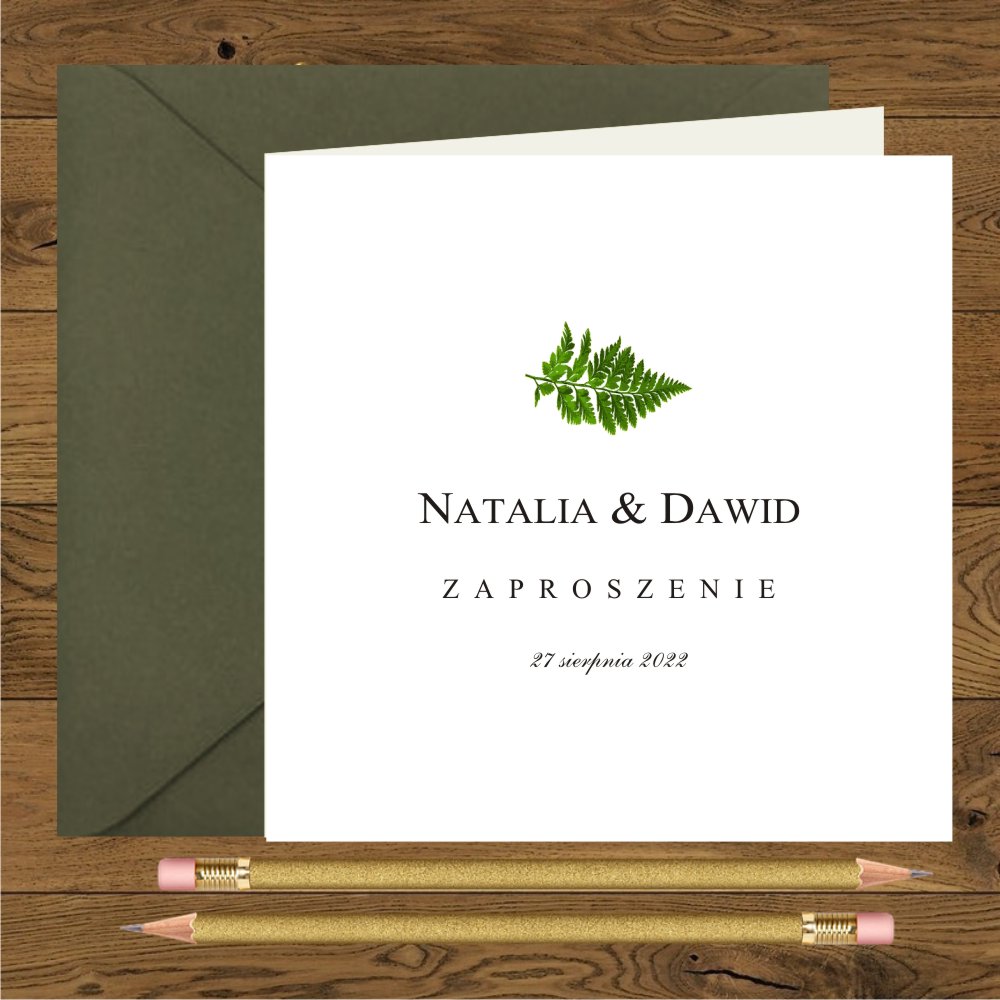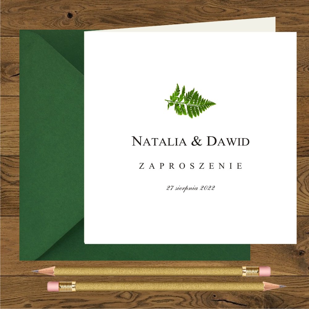 Zaposzenie ślubne z gałązkami paprotki. Kwadratowe, proste. Paprotka