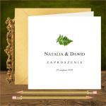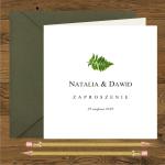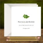 Na okładce zielona galązka paproci. Imiona Pary Młodej, data i słowo zaproszenie, które mozna zamienić na zawiadomienie, pobieramy się czy coś innego.