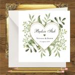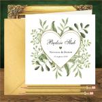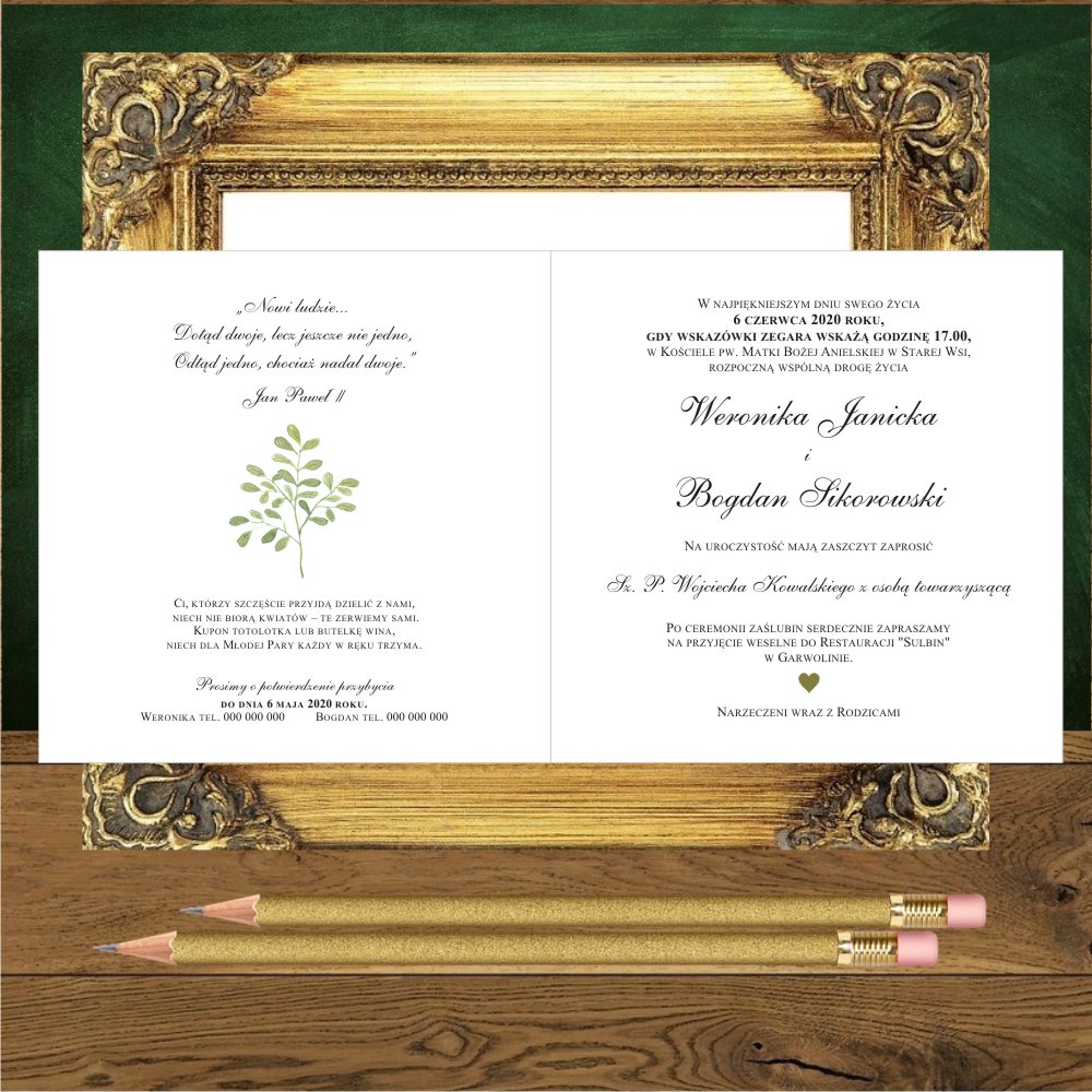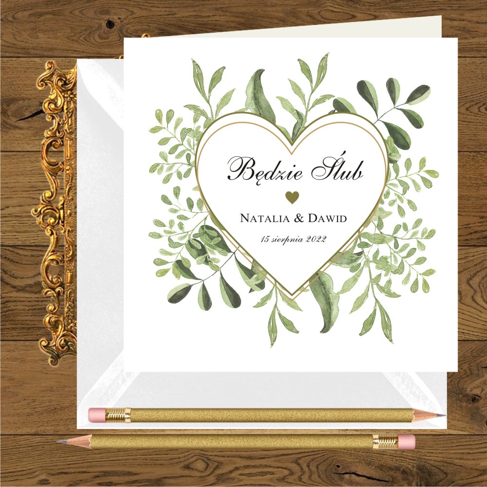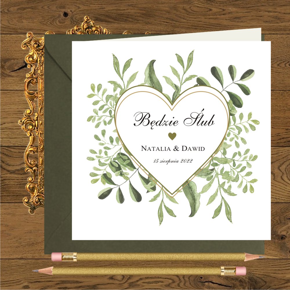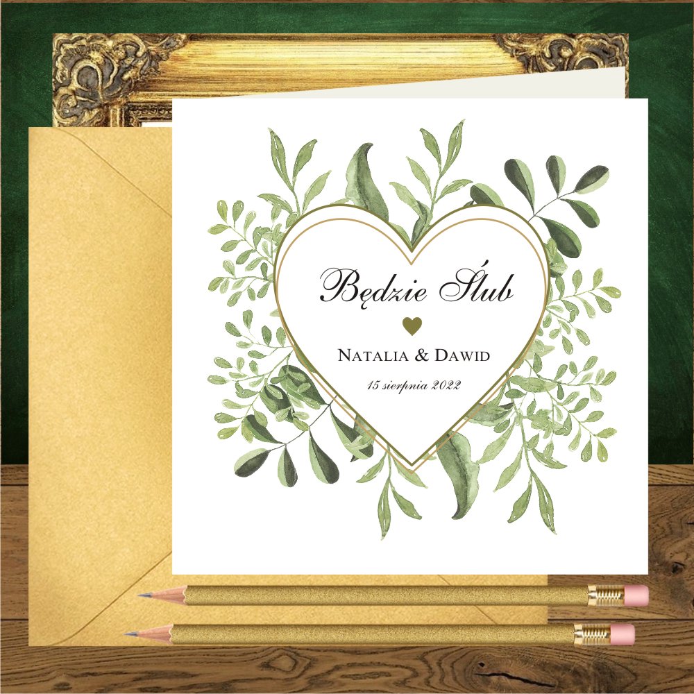 Zaproszenia w stylu boho, rustykalnym na złotym kartoniku. Zielone listki i serduszko mini- serce duże