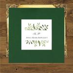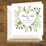 Opis: Zaproszenie biało zielone wykonane z białego papieru. Na froncie zielone gałązki i duże serce. Piękne połaczenie z zieloną kopertą nadaje świeżego eleganckiego stylu. Wyjątkowo dobrze prezentuje sie personalizacja nazwisk na białym papierze takim jak w zaproszeniu naklejonym na kopertę w kolorze butelkowej zieleni.